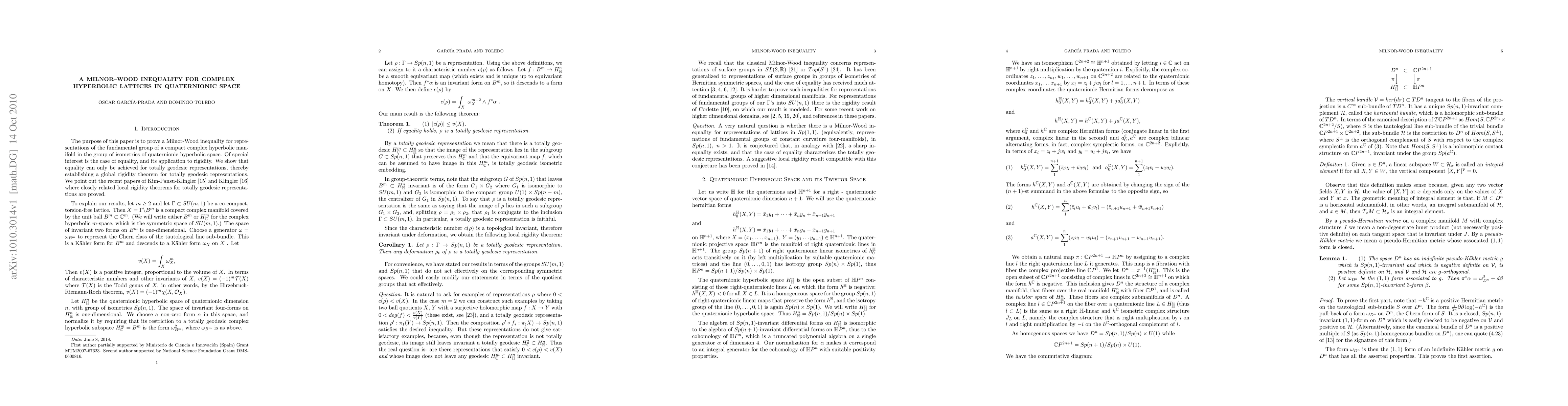 This paper proves a Milnor-Wood inequality for representations of the fundamental group of a compact complex hyperbolic manifold in the isometries of quaternionic hyperbolic space, establishing a rigidity theorem for totally geodesic representations where equality can only occur.