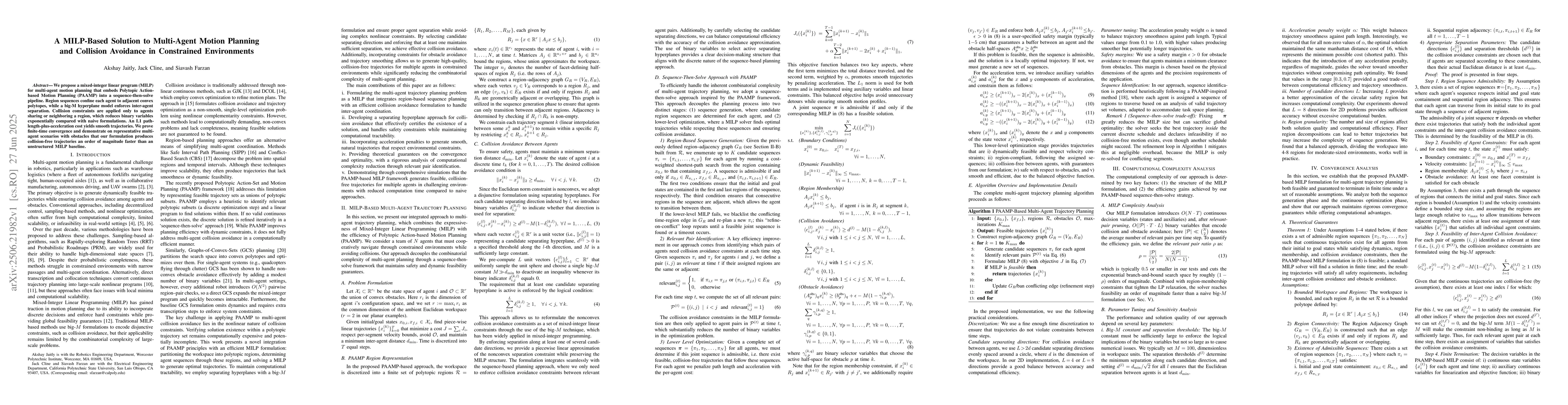 We propose a mixed-integer linear program (MILP) for multi-agent motion planning that embeds Polytopic Action-based Motion Planning (PAAMP) into a sequence-then-solve pipeline. Region sequences confine each agent to adjacent convex polytopes, while a big-M hyperplane model enforces inter-agent separation. Collision constraints are applied only to agents sharing or neighboring a region, which reduces binary variables exponentially compared with naive formulations. An L1 path-length-plus-acceleration cost yields smooth trajectories. We prove finite-time convergence and demonstrate on representative multi-agent scenarios with obstacles that our formulation produces collision-free trajectories an order of magnitude faster than an unstructured MILP baseline.