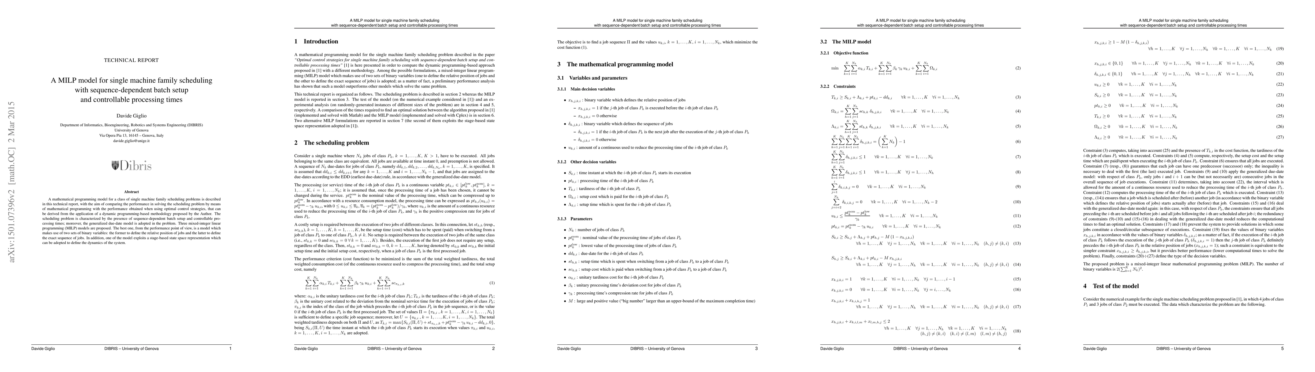 A mathematical programming model for a class of single machine family scheduling problem is described in this technical report, with the aim of comparing the performance in solving the scheduling problem by means of mathematical programming with the performance obtained when using optimal control strategies, that can be derived from the application of a dynamic programming-based methodology proposed by the Author. The scheduling problem is characterized by the presence of sequence-dependent batch setup and controllable processing times; moreover, the generalized due-date model is adopted in the problem. Three mixed-integer linear programming (MILP) models are proposed. The best one, from the performance point of view, is a model which makes use of two sets of binary variables: the former to define the relative position of jobs and the latter to define the exact sequence of jobs. In addition, one of the model exploits a stage-based state space representation which can be adopted to define the dynamics of the system.