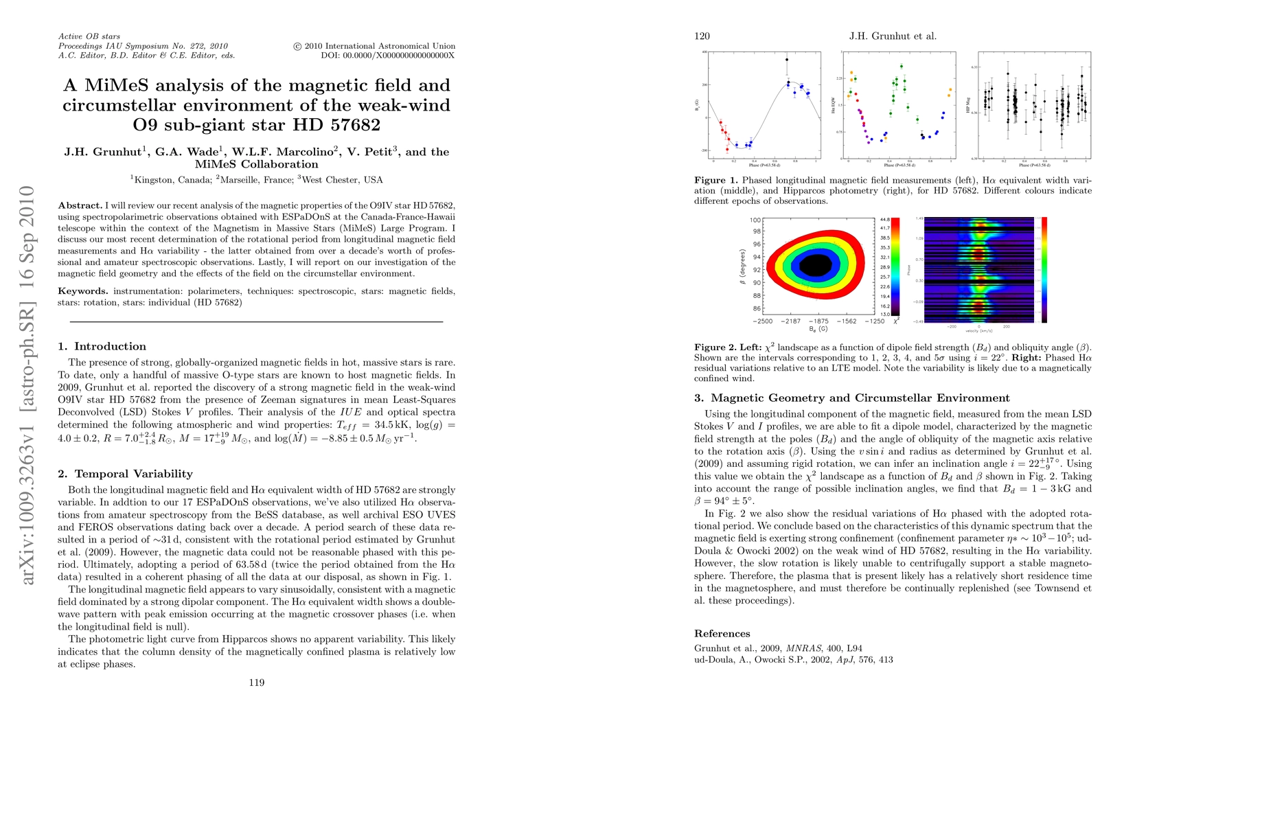 I will review our recent analysis of the magnetic properties of the O9IV star HD 57682, using spectropolarimetric observations obtained with ESPaDOnS at the Canada-France-Hawaii telescope within the context of the Magnetism in Massive Stars (MiMeS) Large Program. I discuss our most recent determination of the rotational period from longitudinal magnetic field measurements and Halpha variability - the latter obtained from over a decade's worth of professional and amateur spectroscopic observations. Lastly, I will report on our investigation of the magnetic field geometry and the effects of the field on the circumstellar environment.