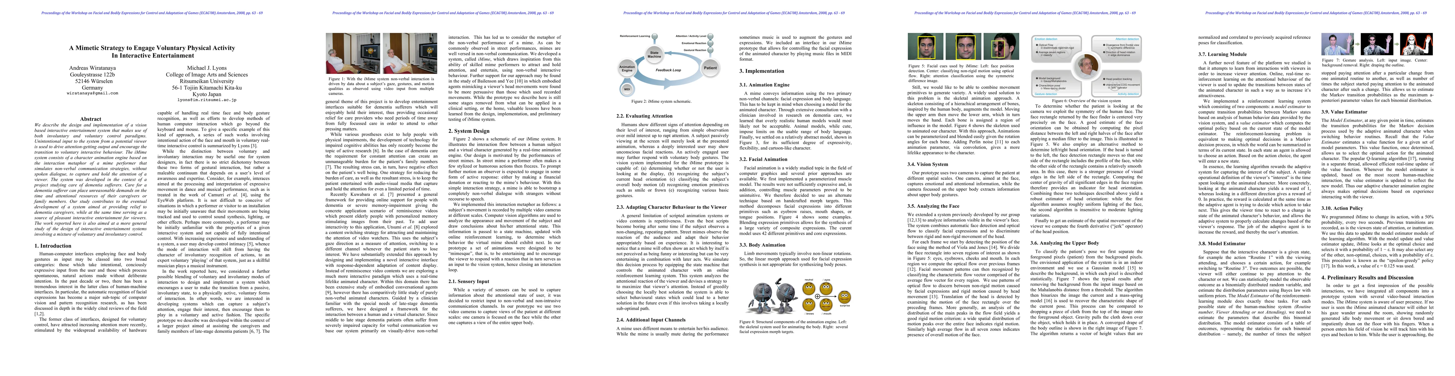 We describe the design and implementation of a vision based interactive entertainment system that makes use of both involuntary and voluntary control paradigms. Unintentional input to the system from a potential viewer is used to drive attention-getting output and encourage the transition to voluntary interactive behaviour. The iMime system consists of a character animation engine based on the interaction metaphor of a mime performer that simulates non-verbal communication strategies, without spoken dialogue, to capture and hold the attention of a viewer. The system was developed in the context of a project studying care of dementia sufferers. Care for a dementia sufferer can place unreasonable demands on the time and attentional resources of their caregivers or family members. Our study contributes to the eventual development of a system aimed at providing relief to dementia caregivers, while at the same time serving as a source of pleasant interactive entertainment for viewers. The work reported here is also aimed at a more general study of the design of interactive entertainment systems involving a mixture of voluntary and involuntary control.