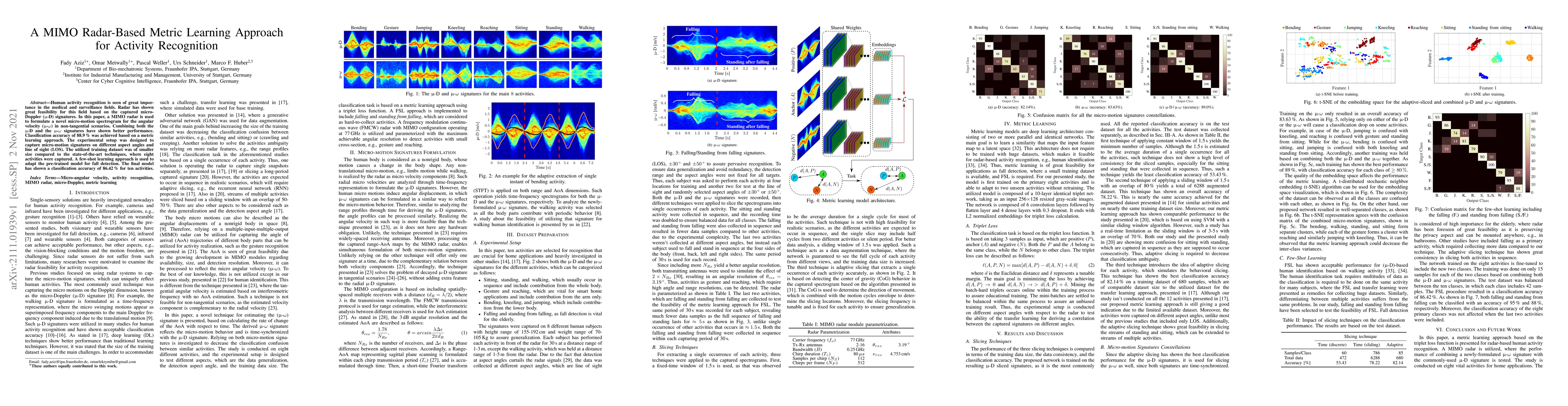 This paper introduces a MIMO radar system to recognize human activities through micro-Doppler signatures and angular velocity metrics, achieving 88.9% accuracy. A few-shot learning approach adapted the model for fall detection, resulting in 86.42% accuracy for ten activities using a smaller training dataset.