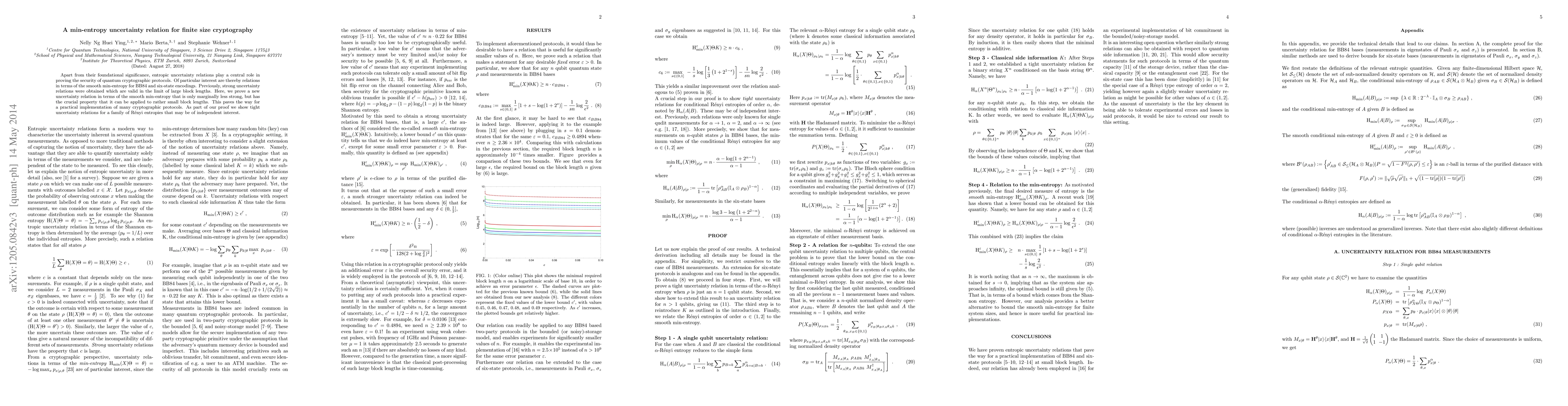Apart from their foundational significance, entropic uncertainty relations play a central role in proving the security of quantum cryptographic protocols. Of particular interest are thereby relations in terms of the smooth min-entropy for BB84 and six-state encodings. Previously, strong uncertainty relations were obtained which are valid in the limit of large block lengths. Here, we prove a new uncertainty relation in terms of the smooth min-entropy that is only marginally less strong, but has the crucial property that it can be applied to rather small block lengths. This paves the way for a practical implementation of many cryptographic protocols. As part of our proof we show tight uncertainty relations for a family of Renyi entropies that may be of independent interest.