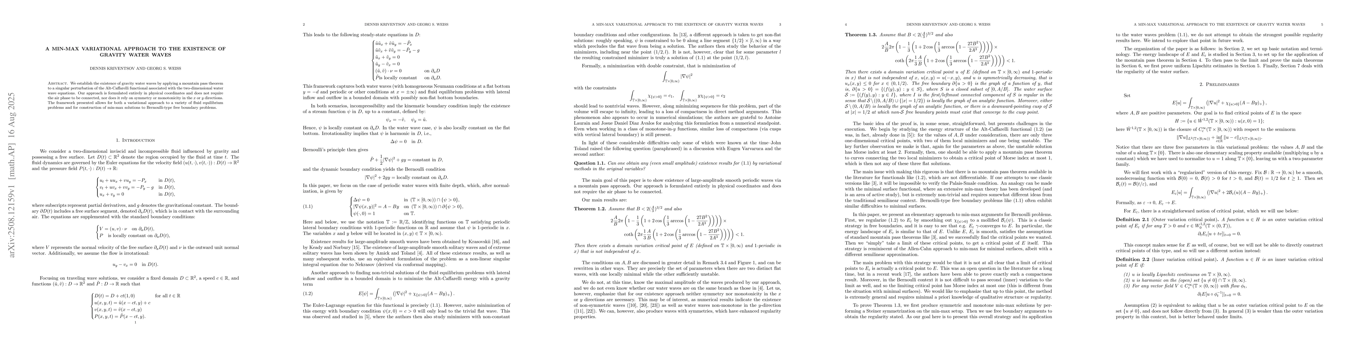We establish the existence of gravity water waves by applying a mountain pass theorem to a singular perturbation of the Alt-Caffarelli functional associated with the two-dimensional water wave equations. Our approach is formulated entirely in physical coordinates and does not require the air phase to be connected, nor does it rely on symmetry or monotonicity in the $x$ or $y$ directions. The framework presented allows for both a variational approach to a variety of fluid equilibrium problems and for construction of min-max solutions to Bernoulli-type free boundary problems.