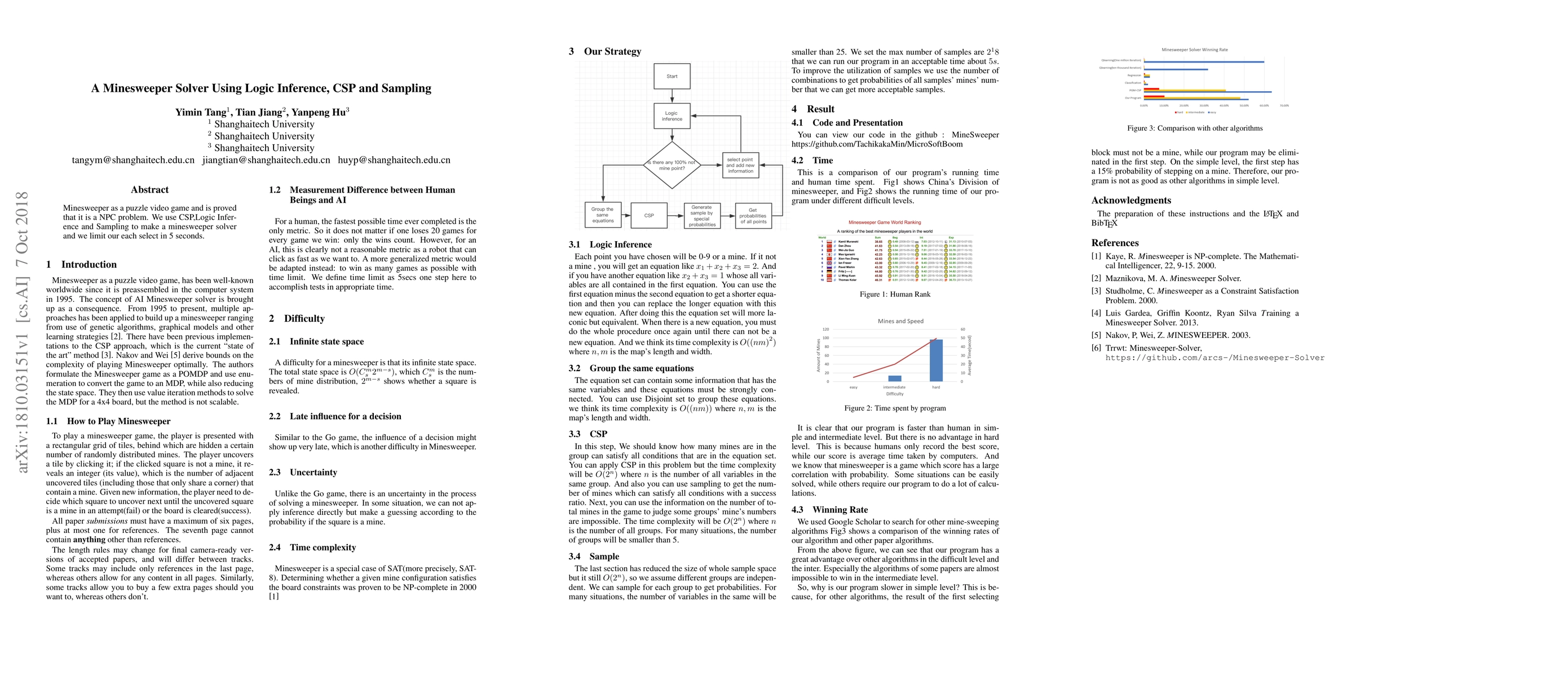 Summary: This paper presents a Minesweeper solver using Constraint Satisfaction Problem (CSP), Logic Inference, and Sampling techniques. The solver operates within a 5-second selection limit to determine the safest moves, proving that Minesweeper is an NPC problem.