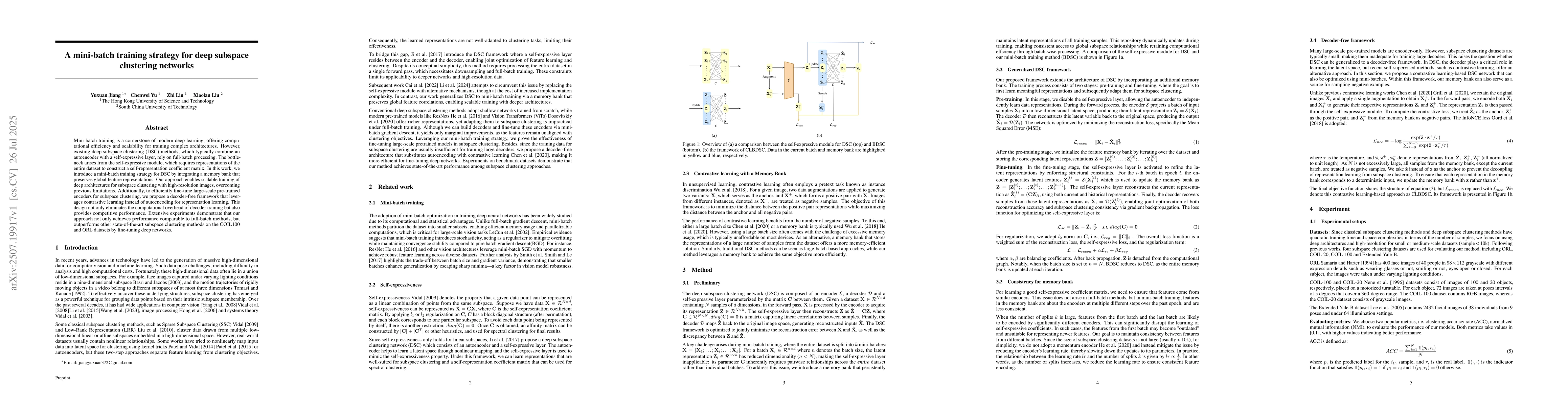 Mini-batch training is a cornerstone of modern deep learning, offering computational efficiency and scalability for training complex architectures. However, existing deep subspace clustering (DSC) methods, which typically combine an autoencoder with a self-expressive layer, rely on full-batch processing. The bottleneck arises from the self-expressive module, which requires representations of the entire dataset to construct a self-representation coefficient matrix. In this work, we introduce a mini-batch training strategy for DSC by integrating a memory bank that preserves global feature representations. Our approach enables scalable training of deep architectures for subspace clustering with high-resolution images, overcoming previous limitations. Additionally, to efficiently fine-tune large-scale pre-trained encoders for subspace clustering, we propose a decoder-free framework that leverages contrastive learning instead of autoencoding for representation learning. This design not only eliminates the computational overhead of decoder training but also provides competitive performance. Extensive experiments demonstrate that our approach not only achieves performance comparable to full-batch methods, but outperforms other state-of-the-art subspace clustering methods on the COIL100 and ORL datasets by fine-tuning deep networks.
