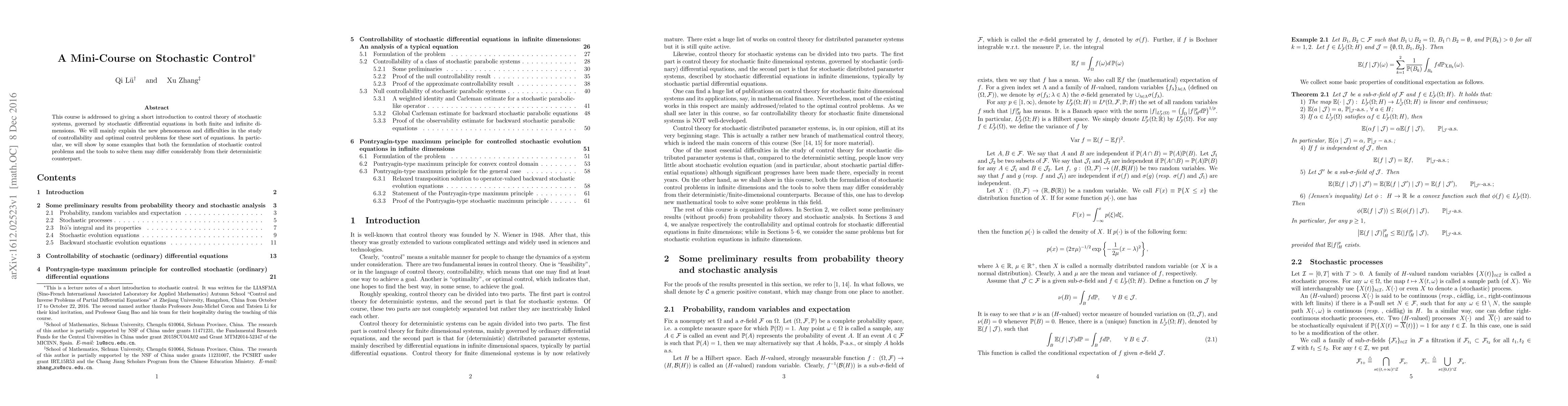 This note is addressed to giving a short introduction to control theory of stochastic systems, governed by stochastic differential equations in both finite and infinite dimensions. We will mainly explain the new phenomenon and difficulties in the study of controllability and optimal control problems for these sort of equations. In particular, we will show by some examples that both the formulation of stochastic control problems and the tools to solve them may differ considerably from their deterministic counterpart.