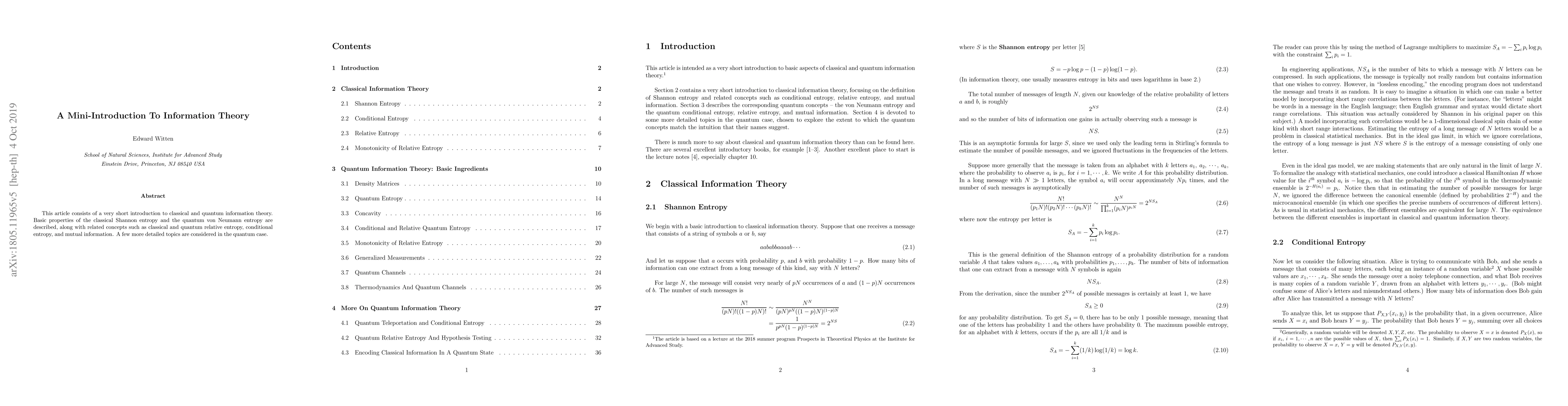This paper provides a concise introduction to classical and quantum information theory, focusing on Shannon and von Neumann entropy, relative entropy, conditional entropy, and mutual information, with a particular emphasis on detailed quantum concepts.