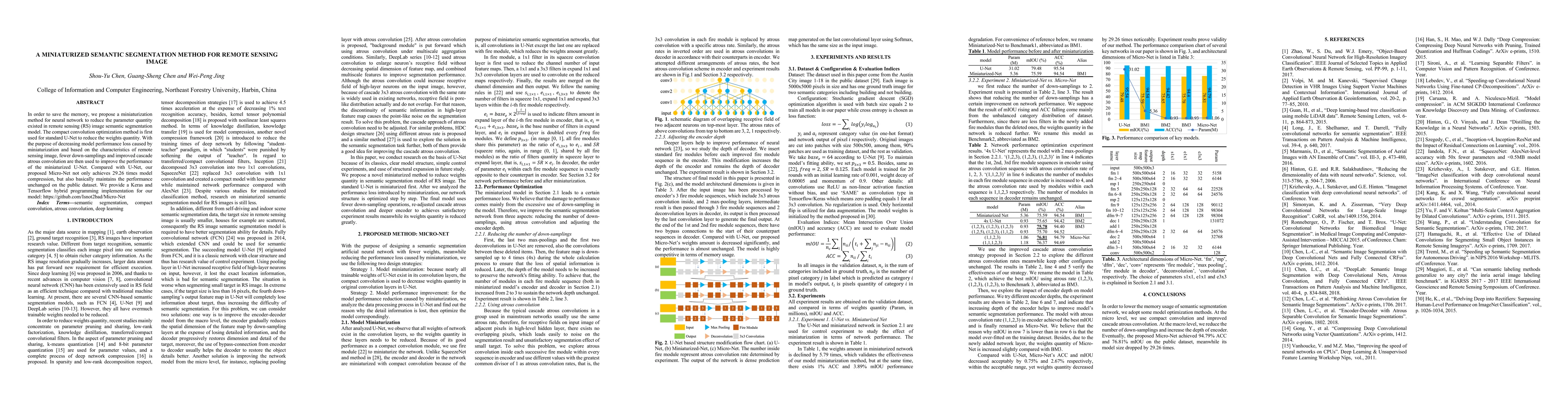 This paper proposes a miniaturized semantic segmentation method for remote sensing images using a compact convolution optimization on U-Net, followed by fewer down-samplings and improved cascade atrous convolution to maintain performance. The resulting Micro-Net achieves 29.26 times model compression while maintaining comparable performance to the original U-Net.