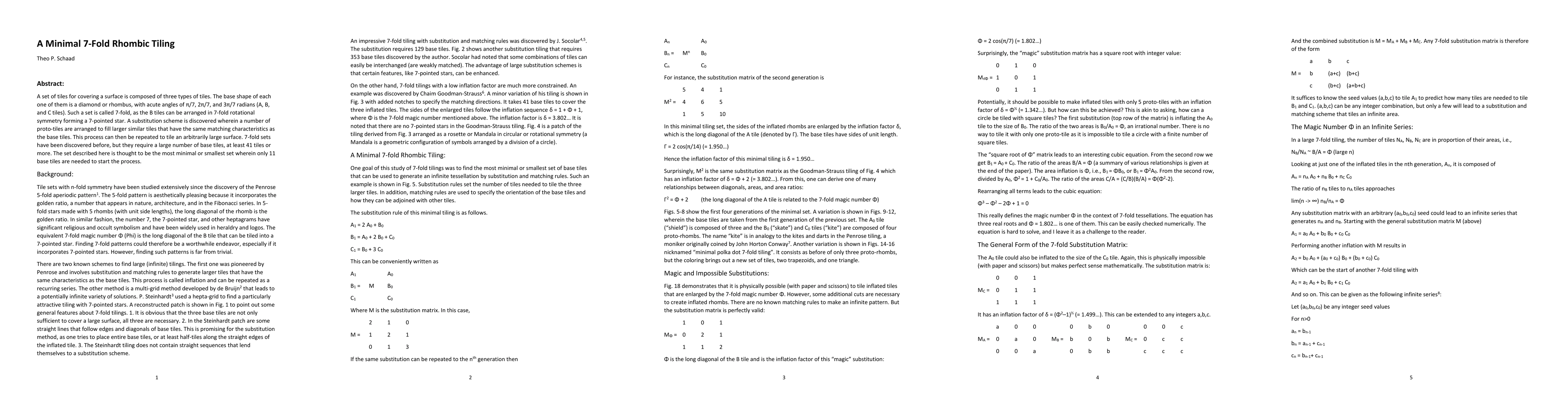 This paper explores minimal 7-fold rhombic tilings using a substitution scheme with three proto-rhombs, revealing a smallest set of 11 proto-rhombs for next-generation inflation. The study derives the role of the 7-fold magic number phi and presents new 7-fold tilings.