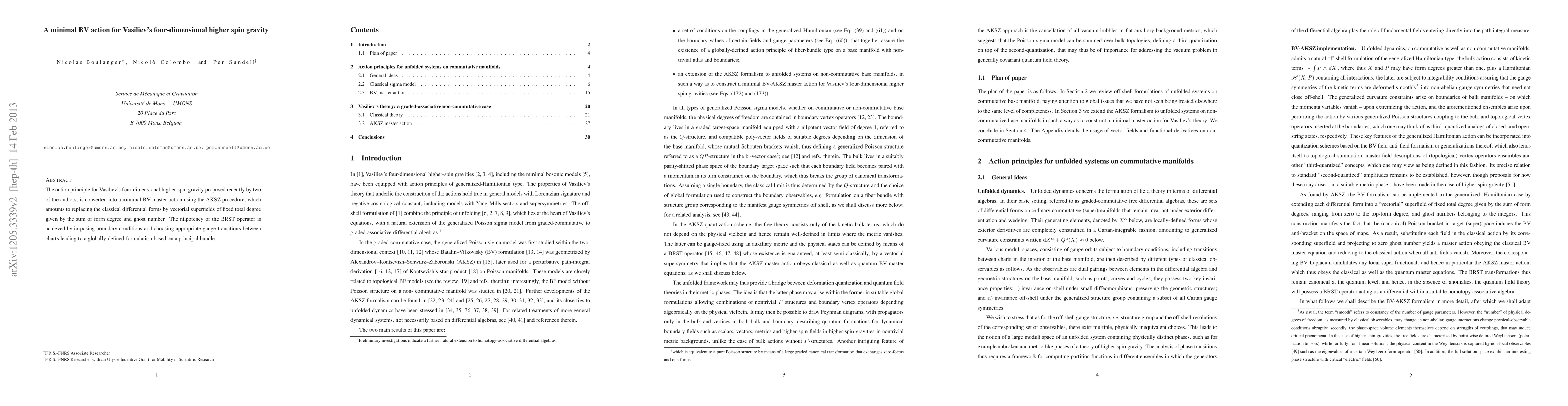 This paper converts Vasiliev's four-dimensional higher-spin gravity action into a minimal BV master action via the AKSZ procedure, employing vectorial superfields and ensuring nilpotency of the BRST operator through boundary conditions and gauge transitions on a principal bundle.