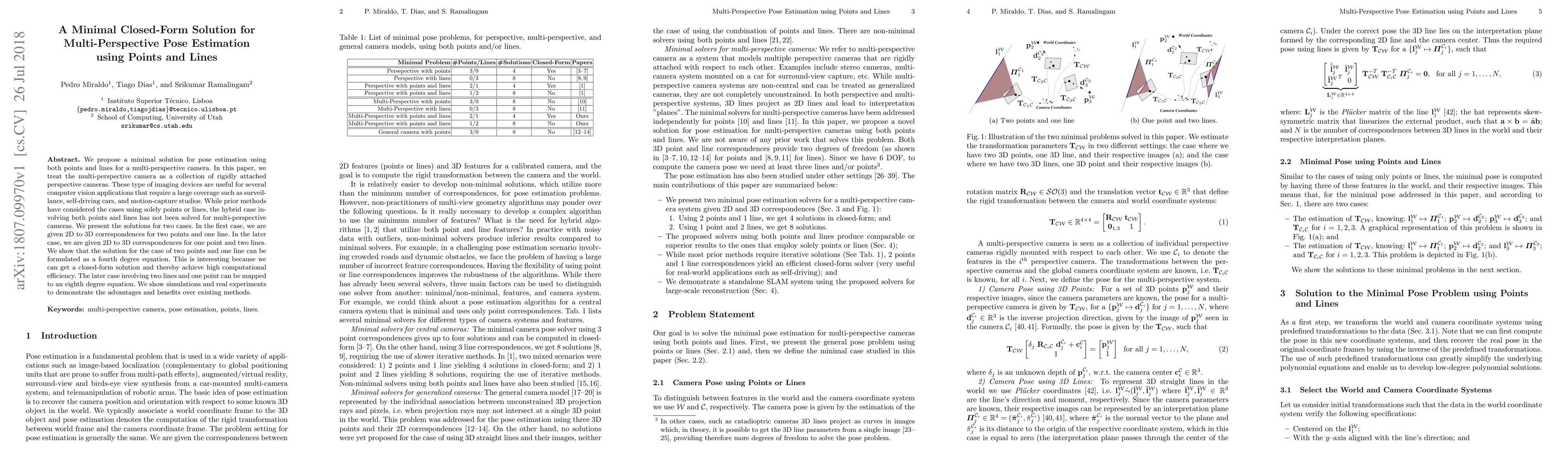 Researchers propose a minimal solution for multi-perspective pose estimation using points and lines from two camera perspectives, achieving high computational efficiency with closed-form equations.