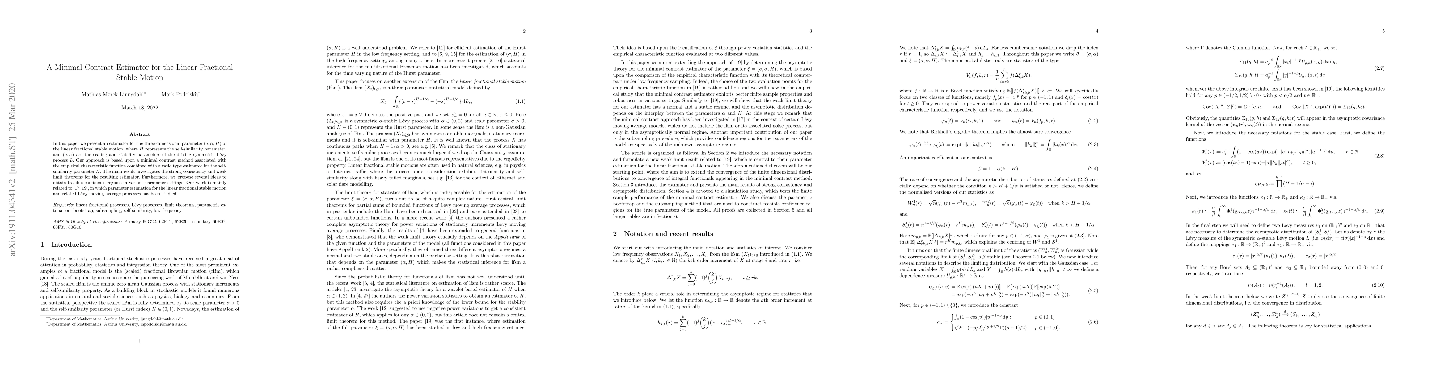 This paper introduces a minimal contrast estimator for the parameters $(\sigma, \alpha, H)$ of linear fractional stable motion, utilizing empirical characteristic functions and a ratio estimator for $H$. It examines the estimator's strong consistency and weak limit theorems, and proposes methods for constructing confidence regions.