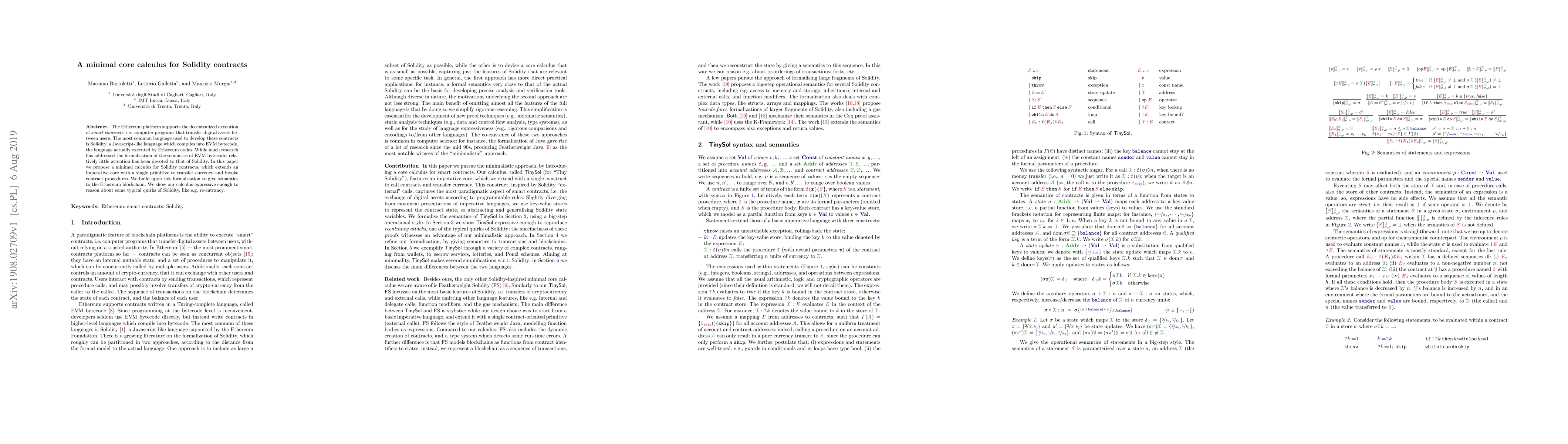 This paper proposes a minimal core calculus to formalize the semantics of Solidity contracts, extending an imperative core with a currency transfer primitive and contract procedure invocation. The authors demonstrate the calculus's expressiveness in reasoning about typical Solidity quirks like re-entrancy.