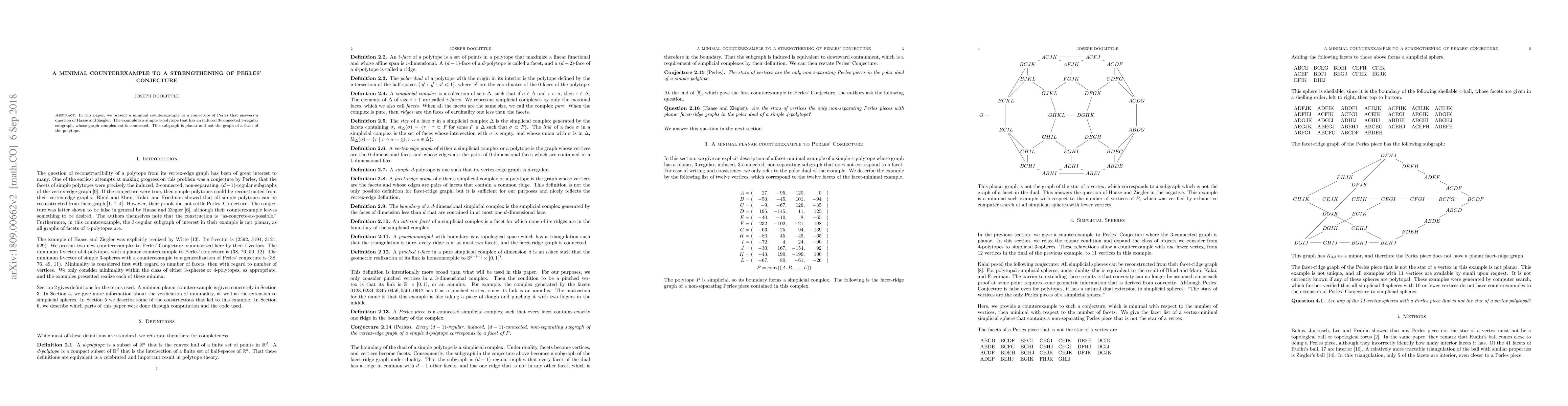 This paper presents a minimal counterexample to a strengthened version of Perles' conjecture, demonstrating a 4-polytope with a specific 3-connected 3-regular subgraph whose complement is connected, and which is planar but not a facet graph. This finding resolves a question posed by Haase and Ziegler.