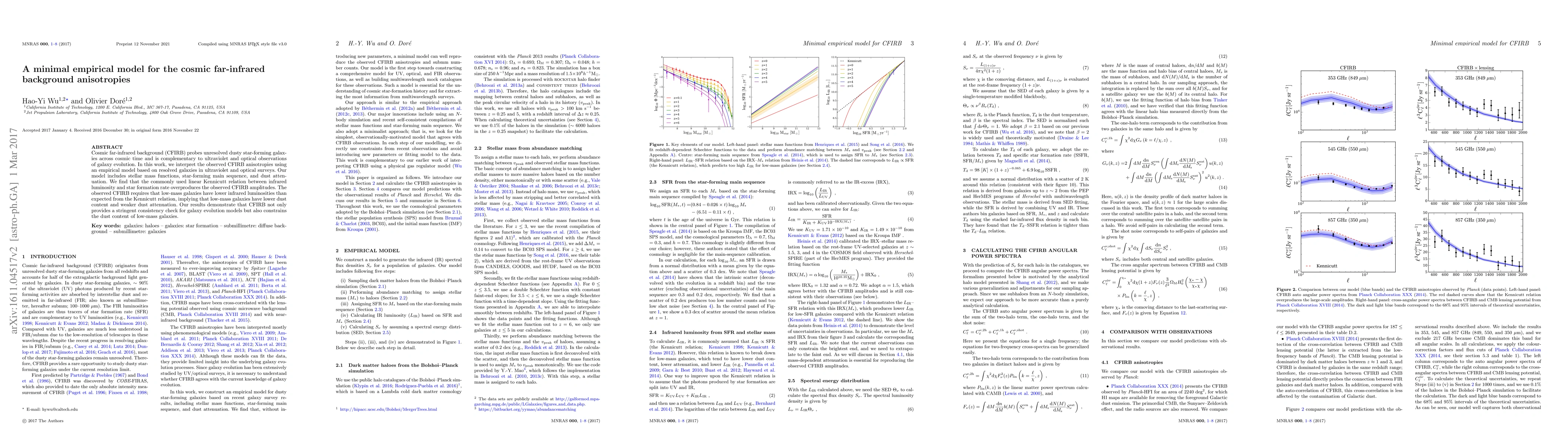 This paper develops an empirical model to interpret cosmic far-infrared background (CFIRB) anisotropies using resolved galaxies from ultraviolet and optical surveys. The study finds that low-mass galaxies have lower infrared luminosities than predicted by the Kennicutt relation, indicating lower dust content and weaker dust attenuation, thus providing insights into galaxy evolution and dust properties.