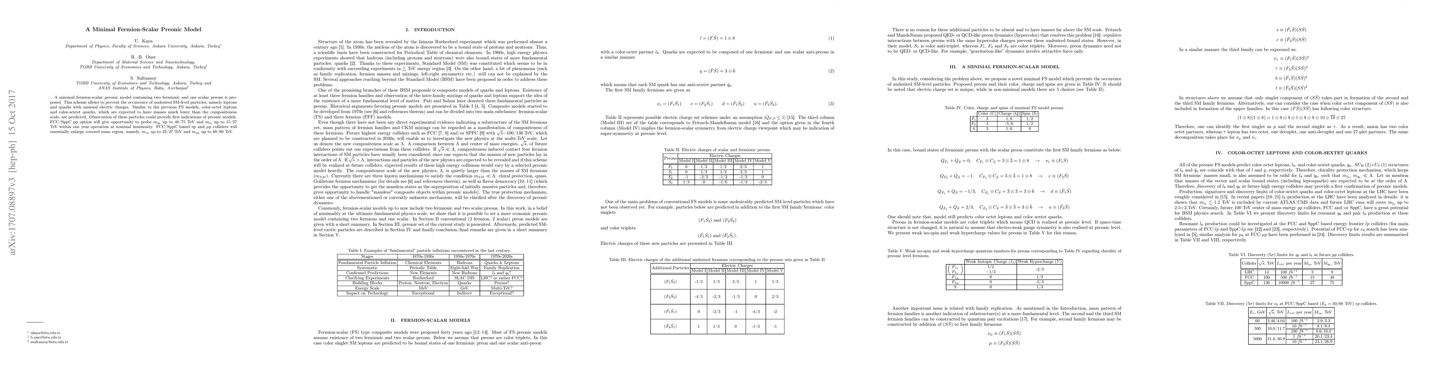 A minimal fermion-scalar preonic model containing two fermionic and one scalar preons is proposed. This scheme allows to prevent the occurrence of undesired SM-level particles, namely leptons and quarks with unusual electric charges. Similar to the previous FS models, color-octet leptons and color-sextet quarks, which are expected to have masses much lower than the compositeness scale, are predicted. Observation of these particles could provide first indications of preonic models. FCC (SppC) pp option will give opportunity to probe $m_{q_{6}}$ up to 48 (75) TeV and $m_{l_{8}}$ up to 15 (27) TeV within one year operation at nominal luminosity. FCC/SppC based ep and $\mu$p colliders will essentially enlarge covered mass region, namely, $m_{e_{8}}$ up to 23/27 TeV and $m_{\mu_{8}}$ up to 68/80 TeV.