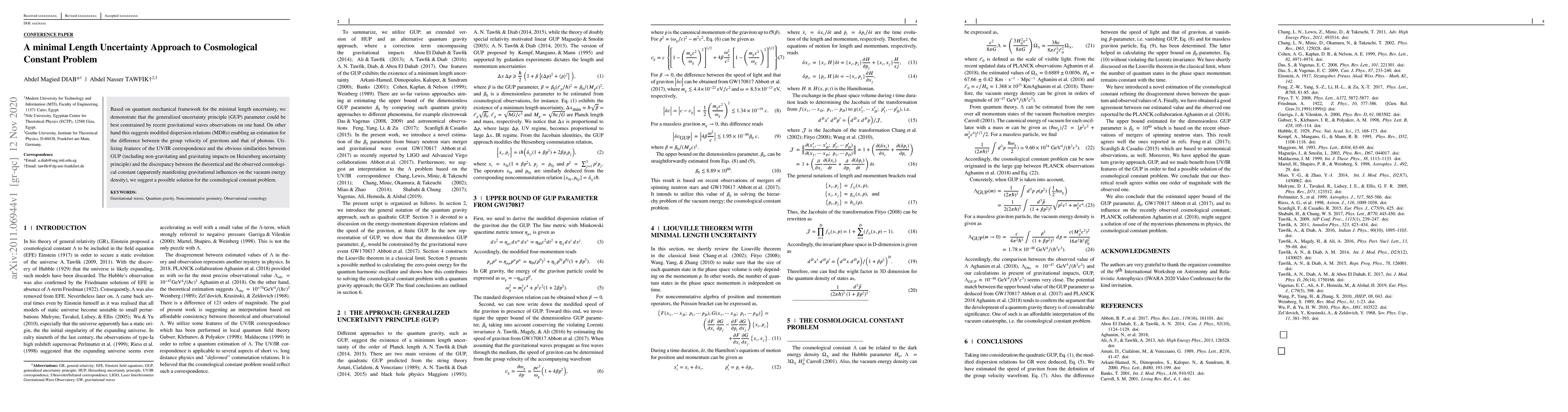 This paper proposes a solution to the cosmological constant problem using a minimal length uncertainty approach, demonstrating that the generalized uncertainty principle (GUP) can be constrained by gravitational wave observations and suggesting modified dispersion relations (MDRs) to estimate the difference in velocities between gravitons and photons. It links GUP to the discrepancy between theoretical and observed vacuum energy densities, offering a potential resolution.