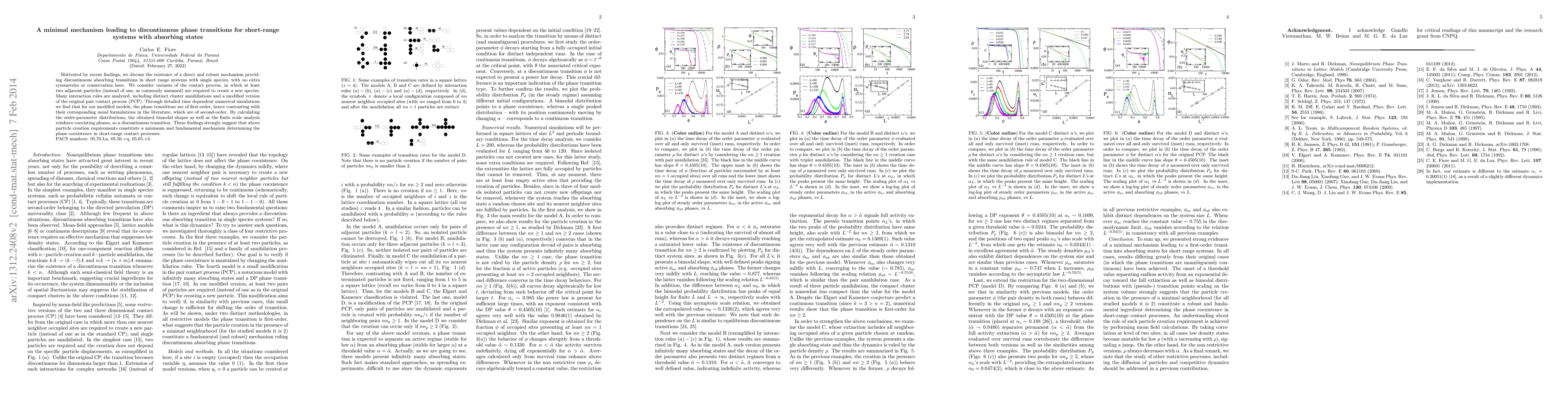 This paper explores a minimal mechanism for discontinuous phase transitions in short-range systems with absorbing states, specifically through a modified contact process requiring at least two adjacent particles to create a new species. Numerical simulations reveal first-order phase transitions, contrasting with the second-order transitions in traditional models, indicating a fundamental role of particle creation requirements in phase coexistence.