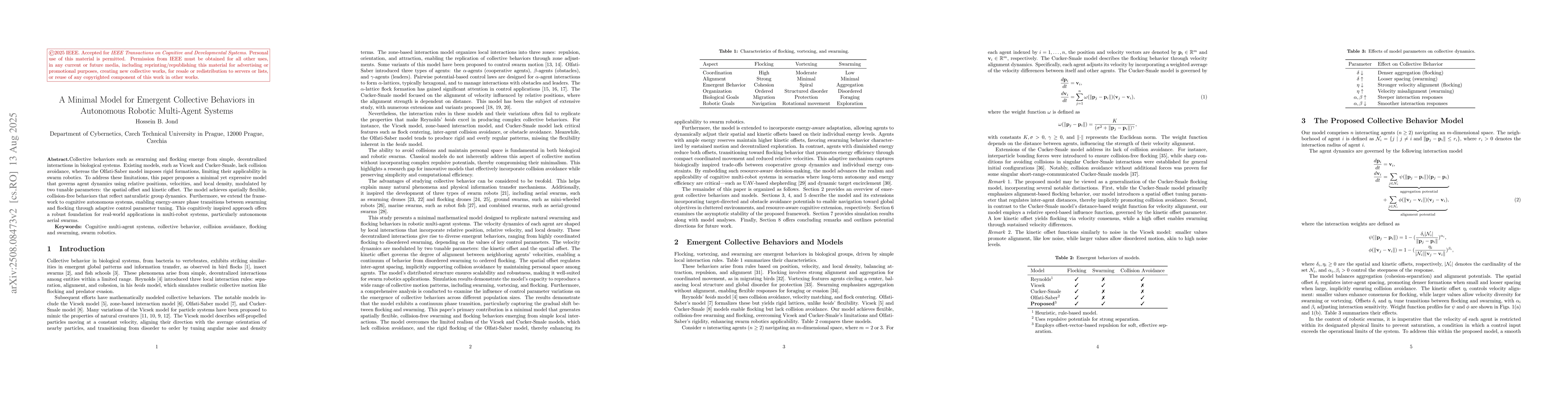 Collective behaviors such as swarming and flocking emerge from simple, decentralized interactions in biological systems. Existing models, such as Vicsek and Cucker-Smale, lack collision avoidance, whereas the Olfati-Saber model imposes rigid formations, limiting their applicability in swarm robotics. To address these limitations, this paper proposes a minimal yet expressive model that governs agent dynamics using relative positions, velocities, and local density, modulated by two tunable parameters: the spatial offset and kinetic offset. The model achieves spatially flexible, collision-free behaviors that reflect naturalistic group dynamics. Furthermore, we extend the framework to cognitive autonomous systems, enabling energy-aware phase transitions between swarming and flocking through adaptive control parameter tuning. This cognitively inspired approach offers a robust foundation for real-world applications in multi-robot systems, particularly autonomous aerial swarms.