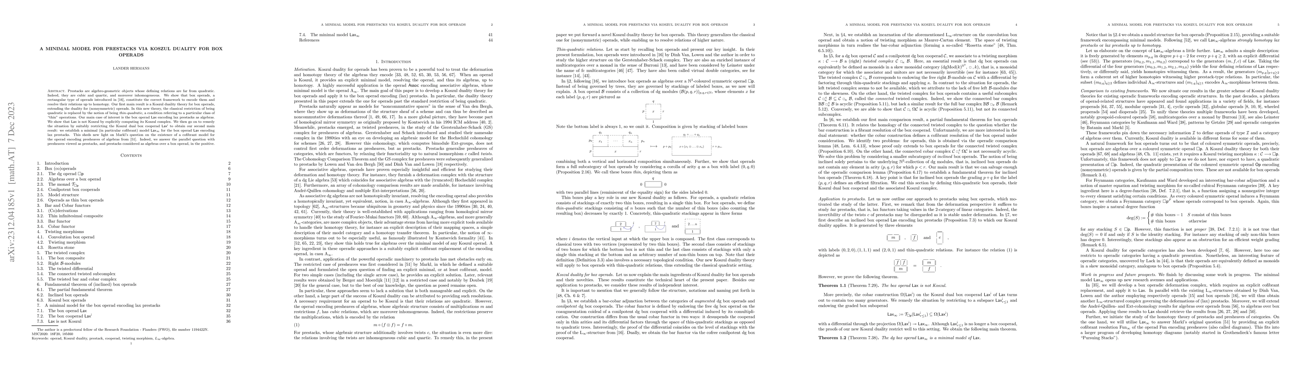Prestacks are algebro-geometric objects whose defining relations are far from quadratic. Indeed, they are cubic and quartic, and moreover inhomogeneous. We show that box operads, a rectangular type of operads introduced in arXiv:2305.20036, constitute the correct framework to encode them and resolve their relations up to homotopy. Our first main result is a Koszul duality theory for box operads, extending the duality for (nonsymmetric) operads. In this new theory, the classical restriction of being quadratic is replaced by the notion of being $\textit{thin-quadratic}$, a condition referring to a particular class of ``thin'' operations. Our main case of interest is the box operad $Lax$ encoding lax prestacks as algebras. We show that $Lax$ is not Koszul by explicitly computing its Koszul complex. We then go on to remedy the situation by suitably restricting the Koszul dual box cooperad $Lax^{\antishriek}$ to obtain our second main result: we establish a minimal (in particular cofibrant) model $Lax_{\infty}$ for the box operad $Lax$ encoding lax prestacks. This sheds new light on Markl's question on the existence of a cofibrant model for the operad encoding presheaves of algebras from arXiv:math/0103052. Indeed, we answer the parallel question with presheaves viewed as prestacks, and prestacks considered as algebras over a box operad, in the positive.