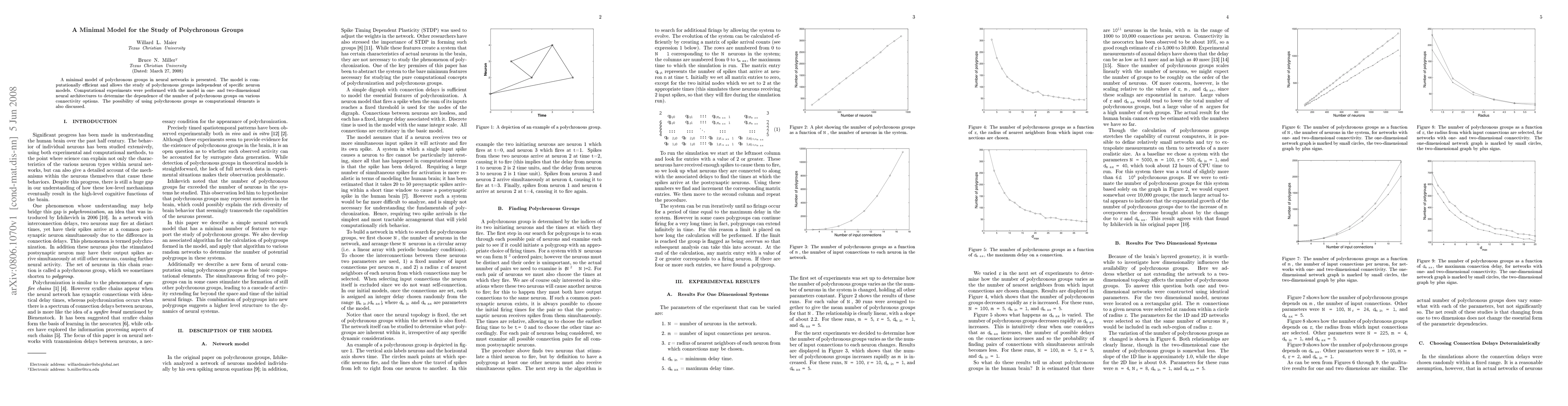 This paper introduces a computationally efficient minimal model for studying polychronous groups in neural networks, demonstrating its application in one- and two-dimensional architectures to explore connectivity effects on group numbers. The study also discusses the potential use of polychronous groups as computational units.