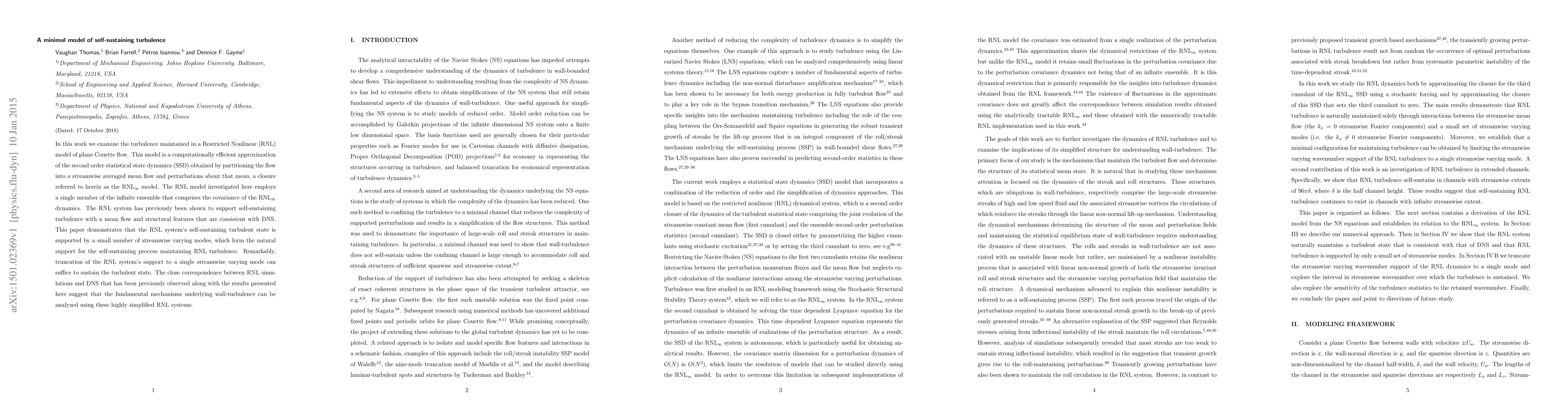 This paper explores a minimal model, the Restricted Nonlinear (RNL) system, for self-sustaining turbulence in plane Couette flow, demonstrating that a small number of streamwise varying modes can maintain the turbulent state. The RNL model's ability to closely match Direct Numerical Simulations (DNS) suggests it can effectively analyze fundamental turbulence mechanisms.