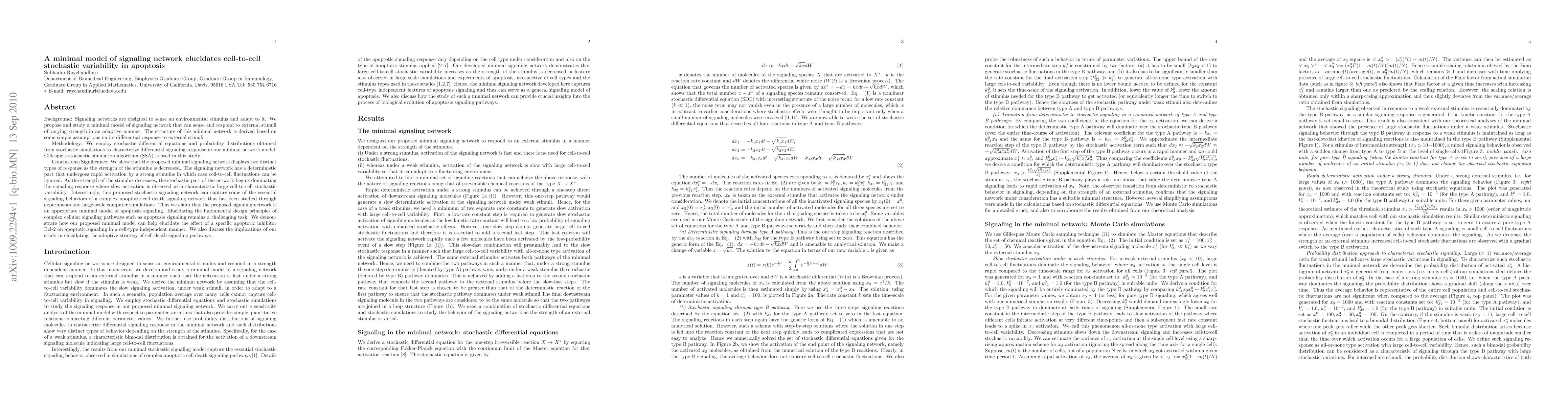 Signaling networks are designed to sense an environmental stimulus and adapt to it. We propose and study a minimal model of signaling network that can sense and respond to external stimuli of varying strength in an adaptive manner. The structure of this minimal network is derived based on some simple assumptions on its differential response to external stimuli. We employ stochastic differential equations and probability distributions obtained from stochastic simulations to characterize differential signaling response in our minimal network model. We show that the proposed minimal signaling network displays two distinct types of response as the strength of the stimulus is decreased. The signaling network has a deterministic part that undergoes rapid activation by a strong stimulus in which case cell-to-cell fluctuations can be ignored. As the strength of the stimulus decreases, the stochastic part of the network begins dominating the signaling response where slow activation is observed with characteristic large cell-to-cell stochastic variability. Interestingly, this proposed stochastic signaling network can capture some of the essential signaling behaviors of a complex apoptotic cell death signaling network that has been studied through experiments and large-scale computer simulations. Thus we claim that the proposed signaling network is an appropriate minimal model of apoptosis signaling. Elucidating the fundamental design principles of complex cellular signaling pathways such as apoptosis signaling remains a challenging task. We demonstrate how our proposed minimal model can help elucidate the effect of a specific apoptotic inhibitor Bcl-2 on apoptotic signaling in a cell-type independent manner. We also discuss the implications of our study in elucidating the adaptive strategy of cell death signaling pathways.