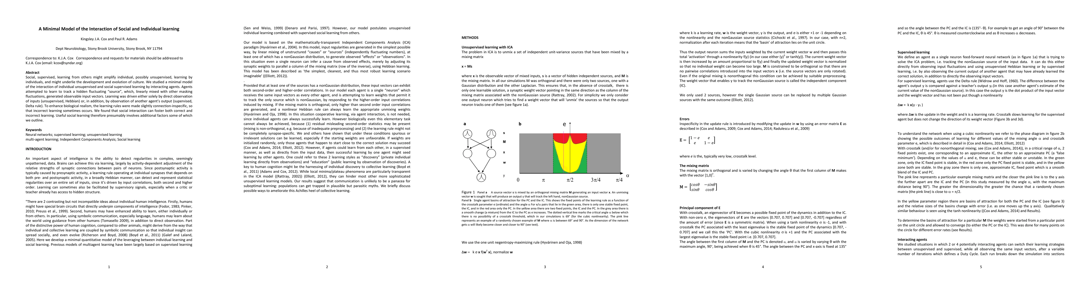 Social, supervised, learning from others might amplify individual, possibly unsupervised, learning by individuals, and might underlie the development and evolution of culture. We studied a minimal model of the interaction of individual unsupervised and social supervised learning by interacting agents. Agents attempted to learn to track a hidden fluctuation "source", which, linearly mixed with other masking fluctuations, generated observable input vectors. Learning was driven either solely by direct observation of inputs (unsupervised, Hebbian) or, in addition, by observation of another agent's output (supervised, Delta rule). To enhance biological realism, the learning rules were made slightly connection-inspecific, so that incorrect learning sometimes occurs. We found that social interaction can foster both correct and incorrect learning. Useful social learning therefore presumably involves additional factors some of which we outline.