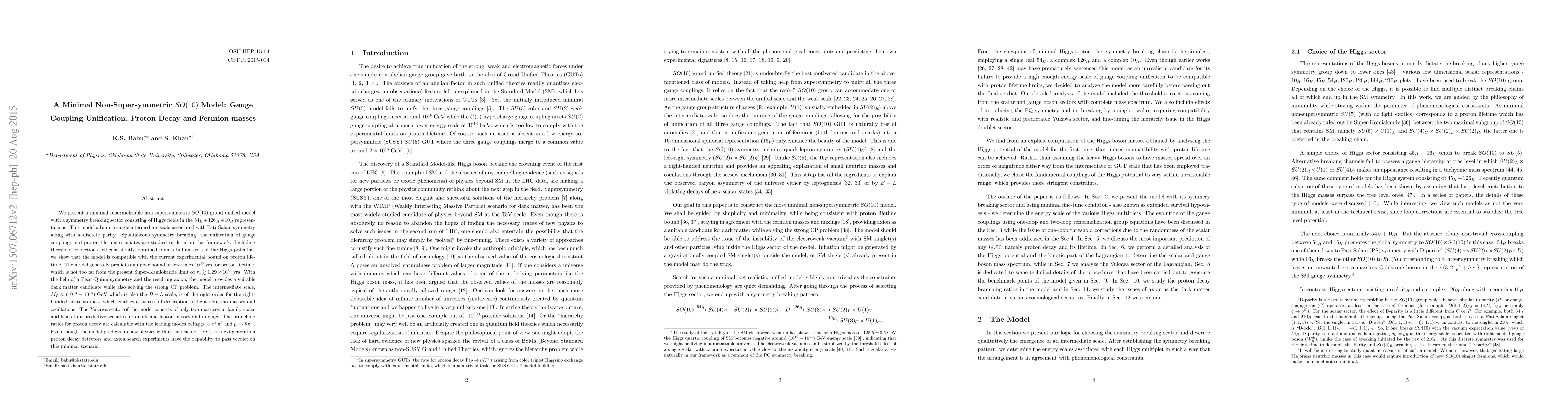 This paper proposes a minimal non-supersymmetric $SO(10)$ grand unified theory model featuring gauge coupling unification, proton decay, and fermion mass predictions. The model includes a discrete parity and predicts proton lifetimes compatible with experimental limits, offering an axion as a dark matter candidate and explaining light neutrino masses.