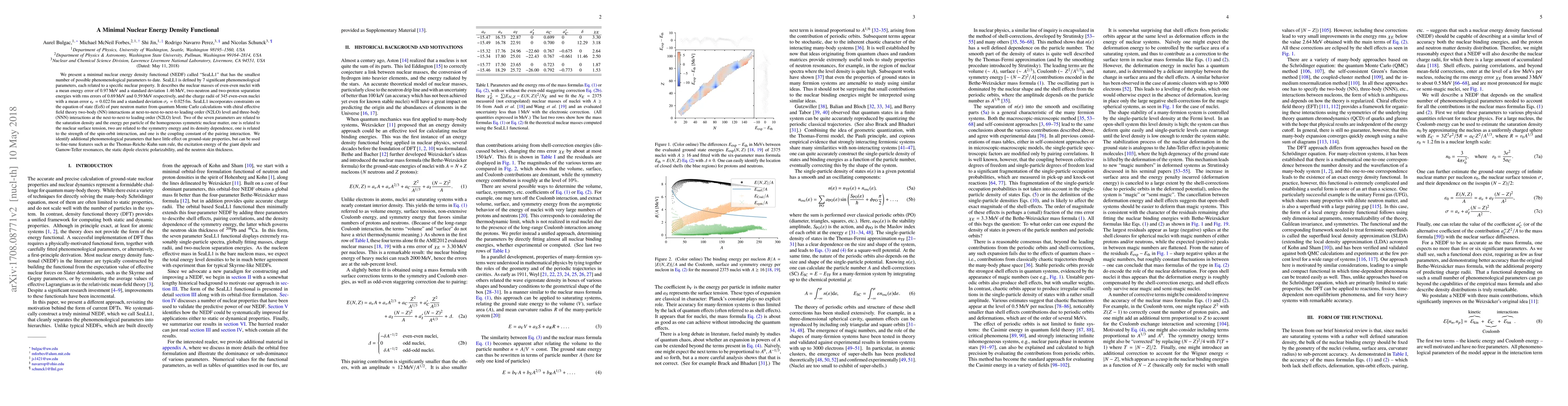 This paper introduces a minimal nuclear energy density functional (NEDF) named SeaLL1, which uses only seven phenomenological parameters to describe nuclear masses, separation energies, and charge radii with high accuracy. SeaLL1 incorporates constraints from quantum Monte Carlo calculations and is designed to minimize the number of free parameters while maintaining predictive power for various nuclear properties.