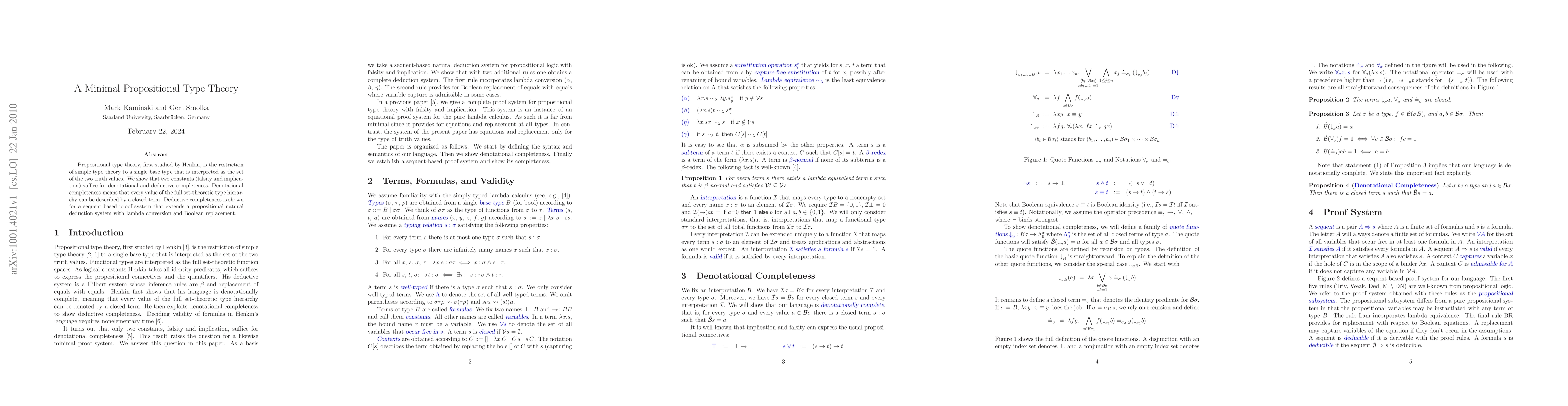 Propositional type theory, first studied by Henkin, is the restriction of simple type theory to a single base type that is interpreted as the set of the two truth values. We show that two constants (falsity and implication) suffice for denotational and deductive completeness. Denotational completeness means that every value of the full set-theoretic type hierarchy can be described by a closed term. Deductive completeness is shown for a sequent-based proof system that extends a propositional natural deduction system with lambda conversion and Boolean replacement.