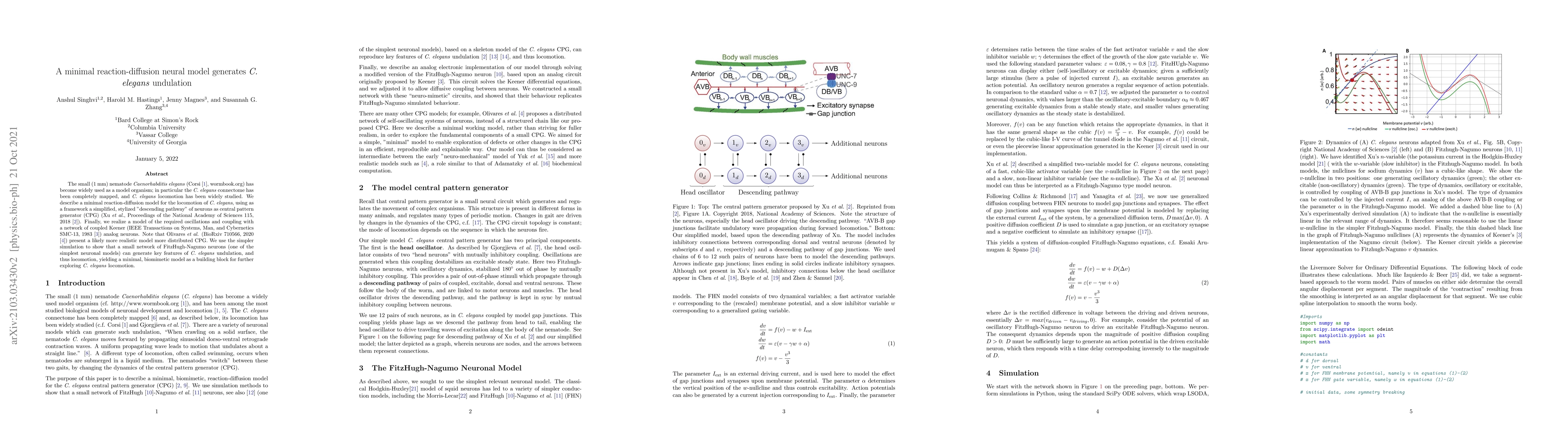 The small (1 mm) nematode $\textit{Caenorhabditis elegans}$ (Corsi [1], wormbook.org) has become widely used as a model organism; in particular, the $\textit{C. elegans}$ connectome has been completely mapped, and $\textit{C. elegans}$ locomotion has been widely studied. We describe a minimal reaction-diffusion model for the locomotion of $\textit{C. elegans}$, using as a framework a simplified, stylized "descending pathway" of neurons as central pattern generator (CPG) (Xu et al., Proceedings of the National Academy of Sciences 115, 2018). Finally, we realize a model of the required oscillations and coupling with a network of coupled Keener (IEEE Transactions on Systems, Man, and Cybernetics SMC-13, 1983 [3]) analog neurons. Note that Olivares et al. (BioRxiv 710566, 2020 [4]) present a likely more realistic model more distributed CPG. We use the simpler simulation to show that a small network of FitzHugh-Nagumo neurons (one of the simplest neuronal models) can generate key features of $\textit{C. elegans}$ undulation, and thus locomotion, yielding a minimal, biomimetic model as a building block for further exploring $\textit{C. elegans}$ locomotion.