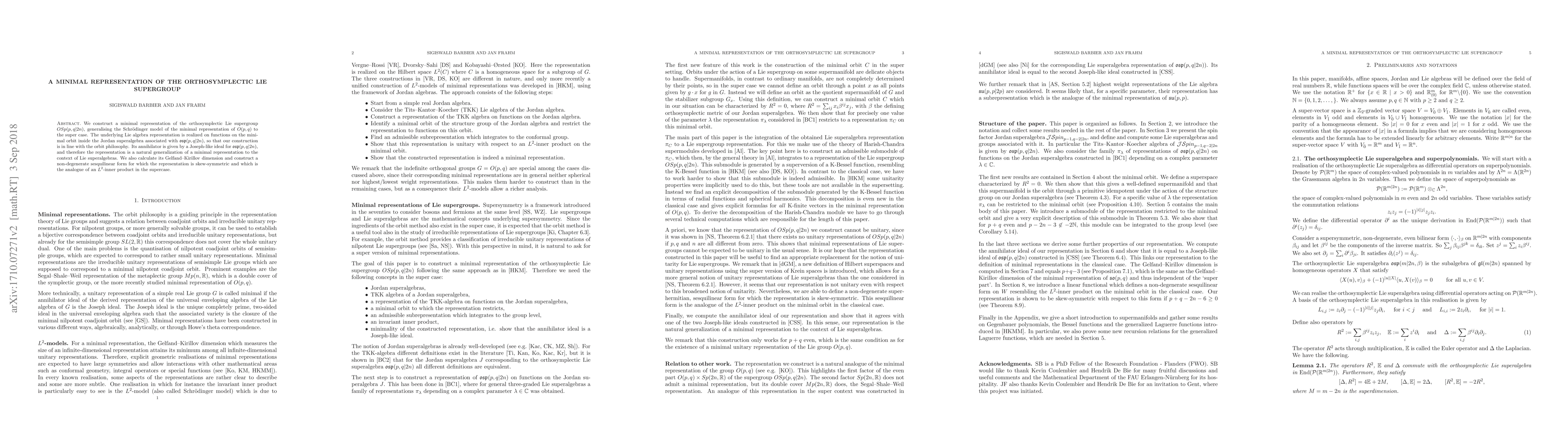We construct a minimal representation of the orthosymplectic Lie supergroup $OSp(p,q|2n)$, generalising the Schr\"odinger model of the minimal representation of $O(p,q)$ to the super case. The underlying Lie algebra representation is realized on functions on the minimal orbit inside the Jordan superalgebra associated with $\mathfrak{osp}(p,q|2n)$, so that our construction is in line with the orbit philosophy. Its annihilator is given by a Joseph-like ideal for $\mathfrak{osp}(p,q|2n)$, and therefore the representation is a natural generalization of a minimal representations to the context of Lie superalgebras. We also calculate its Gelfand--Kirillov dimension and construct a non-degenerate sesquilinear form for which the representation is skew-symmetric and which is the analogue of an $L^2$-inner product in the supercase.