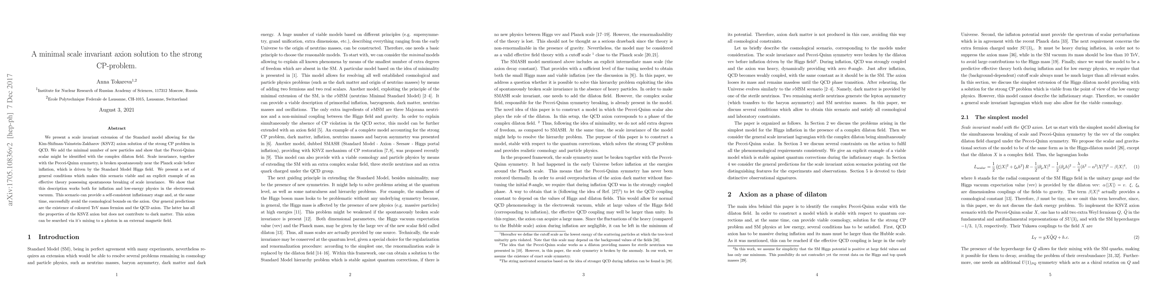 We present a scale invariant extension of the Standard model allowing for the Kim-Shifman-Vainstein-Zakharov (KSVZ) axion solution of the strong CP problem in QCD. We add the minimal number of new particles and show that the Peccei-Quinn scalar might be identified with the complex dilaton field. Scale invariance, together with the Peccei-Quinn symmetry, is broken spontaneously near the Planck scale before inflation, which is driven by the Standard Model Higgs field. We present a set of general conditions which makes this scenario viable and an explicit example of an effective theory possessing spontaneous breaking of scale invariance. We show that this description works both for inflation and low-energy physics in the electroweak vacuum. This scenario can provide a self-consistent inflationary stage and, at the same time, successfully avoid the cosmological bounds on the axion. Our general predictions are the existence of coloured TeV mass fermion and the QCD axion. The latter has all the properties of the KSVZ axion but does not contribute to dark matter. This axion can be searched via it's mixing to a photon in an external magnetic field.
