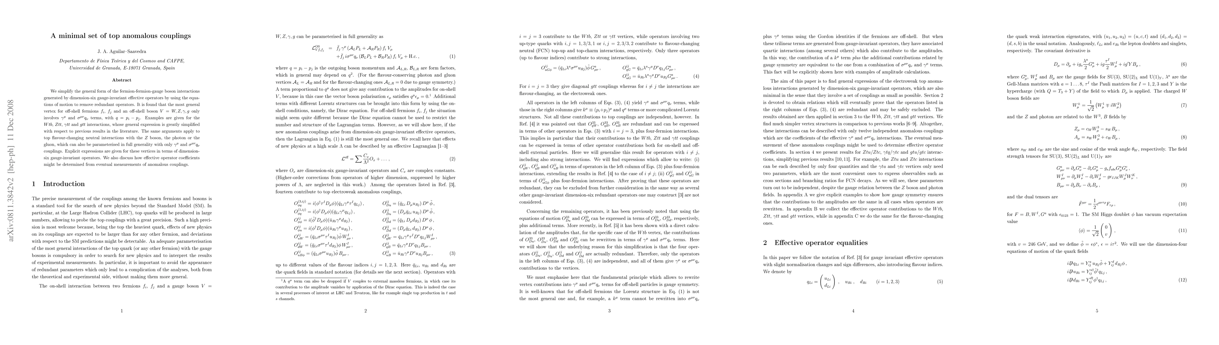 We simplify the general form of the fermion-fermion-gauge boson interactions generated by dimension-six gauge-invariant effective operators by using the equations of motion to remove redundant operators. It is found that the most general vertex for off-shell fermions fi, fj and an off-shell boson V=W,Z,gamma,g only involves gamma^mu and sigma^{mu nu} q_nu terms, with q=p_i-p_j. Examples are given for the Wtb, Ztt, gamma tt and gtt interactions, whose general expression is greatly simplified with respect to previous results in the literature. The same arguments apply to top flavour-changing neutral interactions with the Z boson, the photon or the gluon, which can also be parameterised in full generality with only gamma^mu and sigma^{mu nu} q_nu couplings. Explicit expressions are given for these vertices in terms of dimension-six gauge-invariant operators. We also discuss how effective operator coefficients might be determined from eventual measurements of anomalous couplings.