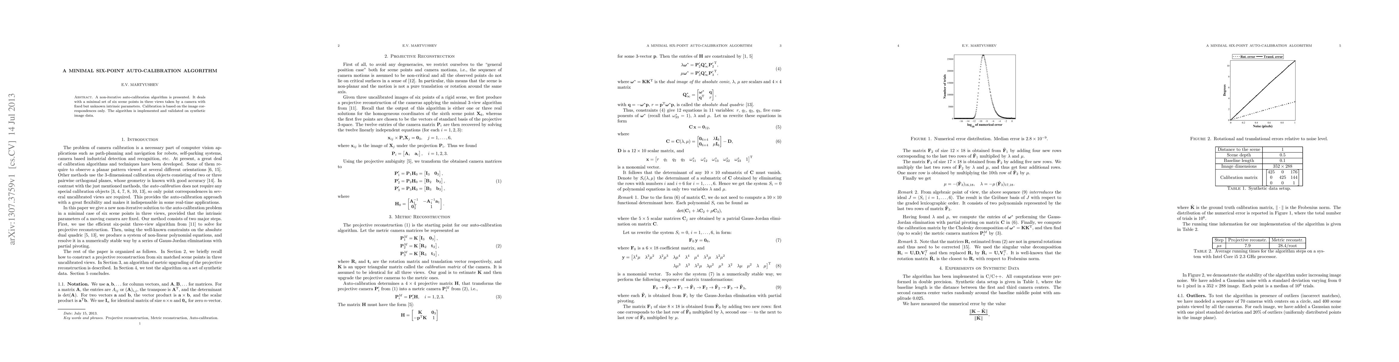 Summary: This paper introduces a non-iterative auto-calibration algorithm that uses a minimal set of six scene points across three camera views to determine unknown intrinsic parameters, relying solely on image correspondences, and is validated through synthetic data.