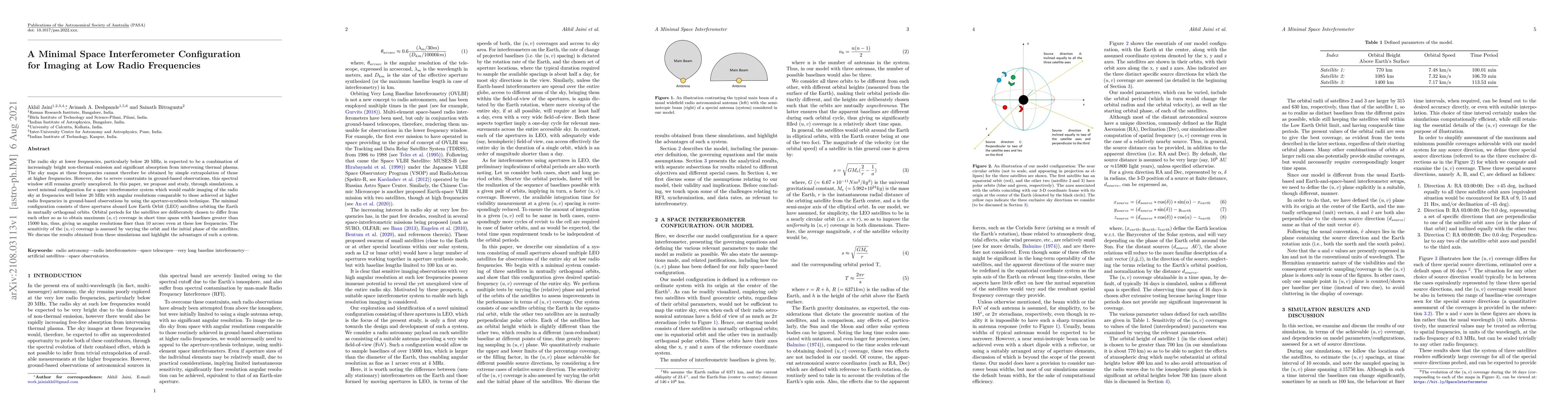 The radio sky at lower frequencies, particularly below 20 MHz, is expected to be a combination of increasingly bright non-thermal emission and significant absorption from intervening thermal plasma. The sky maps at these frequencies cannot therefore be obtained by simple extrapolation of those at higher frequencies. However, due to severe constraints in ground-based observations, this spectral window still remains greatly unexplored. In this paper, we propose and study, through simulations, a novel minimal configuration for a space interferometer system which would enable imaging of the radio sky at frequencies well below 20 MHz with angular resolutions comparable to those achieved at higher radio frequencies in ground-based observations by using the aperture-synthesis technique. The minimal configuration consists of three apertures aboard Low Earth Orbit (LEO) satellites orbiting the Earth in mutually orthogonal orbits. Orbital periods for the satellites are deliberately chosen to differ from each other so as to obtain maximum (u, v) coverage in short time spans with baselines greater than 15000 km, thus, giving us angular resolutions finer than 10 arcsec even at these low frequencies. The sensitivity of the (u, v) coverage is assessed by varying the orbit and the initial phase of the satellites. We discuss the results obtained from these simulations and highlight the advantages of such a system.