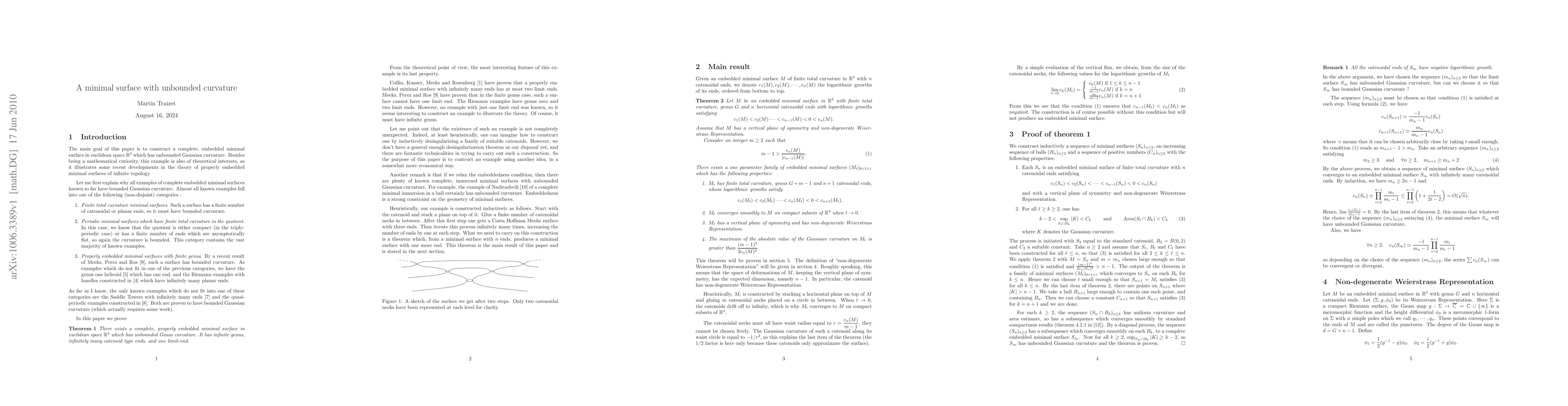 Researchers created a complete, embedded minimal surface with unbounded curvature in 3D space, featuring infinite genus and multiple types of ends.