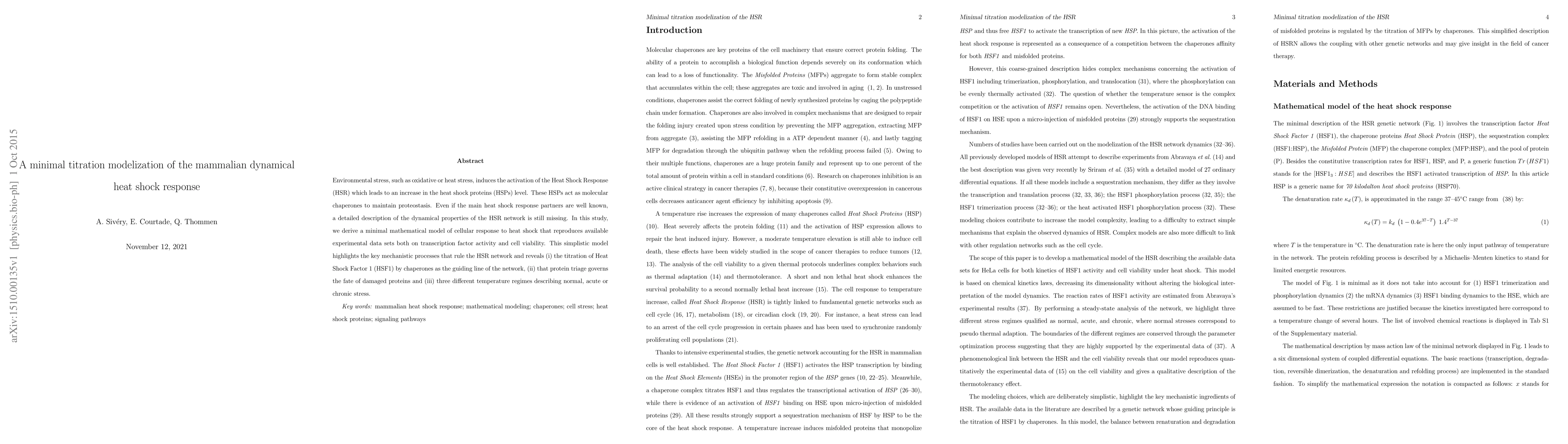 Environmental stress, such as oxidative or heat stress, induces the activation of the Heat Shock Response (HSR) which leads to an increase in the heat shock proteins (HSPs) level. These HSPs act as molecular chaperones to maintain proteostasis. Even if the main heat shock response partners are well known, a detailed description of the dynamical properties of the HSR network is still missing. In this study, we derive a minimal mathematical model of cellular response to heat shock that reproduces available experimental data sets both on transcription factor activity and cell viability. This simplistic model highlights the key mechanistic processes that rule the HSR network and reveals (i) the titration of Heat Shock Factor 1 (HSF1) by chaperones as the guiding line of the network, (ii) that protein triage governs the fate of damaged proteins and (iii) three different temperature regimes describing normal, acute or chronic stress.