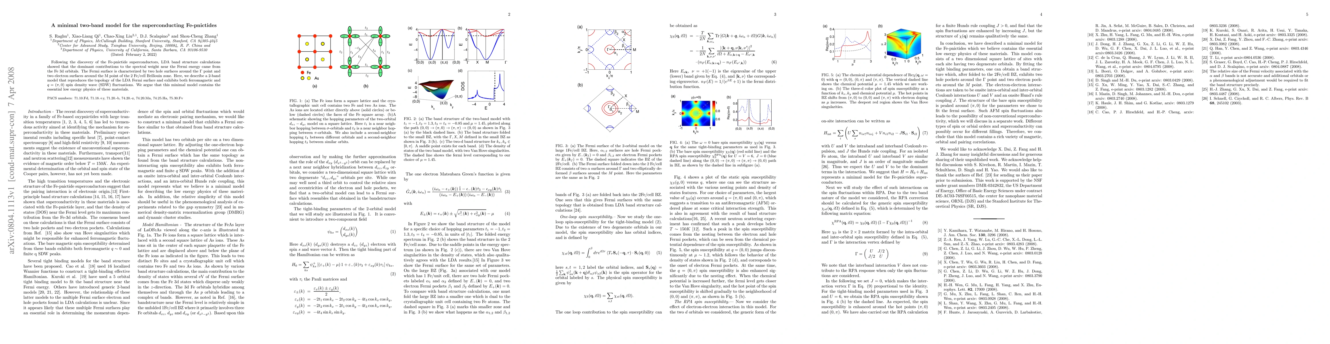 Following the discovery of the Fe-pnictide superconductors, LDA band structure calculations showed that the dominant contributions to the spectral weight near the Fermi energy came from the Fe 3d orbitals. The Fermi surface is characterized by two hole surfaces around the $\Gamma$ point and two electron surfaces around the M point of the 2 Fe/cell Brillouin zone. Here, we describe a 2-band model that reproduces the topology of the LDA Fermi surface and exhibits both ferromagnetic and $q=(\pi,0)$ spin density wave (SDW) fluctuations. We argue that this minimal model contains the essential low energy physics of these materials.