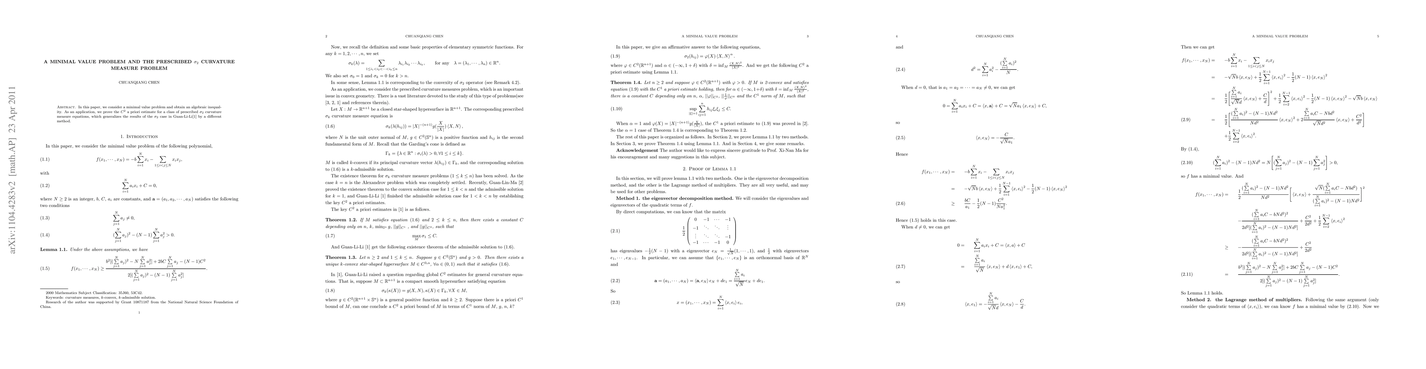 In this paper, we consider a minimal value problem and obtain an algebraic inequality. As an application, we prove the $C^2$ a priori estimate for a class of prescribed $\sigma_2$ curvature measure equations, which generalizes the results of the $\sigma_2$ case in Guan-Li-Li\cite{GLL11} by a different method.