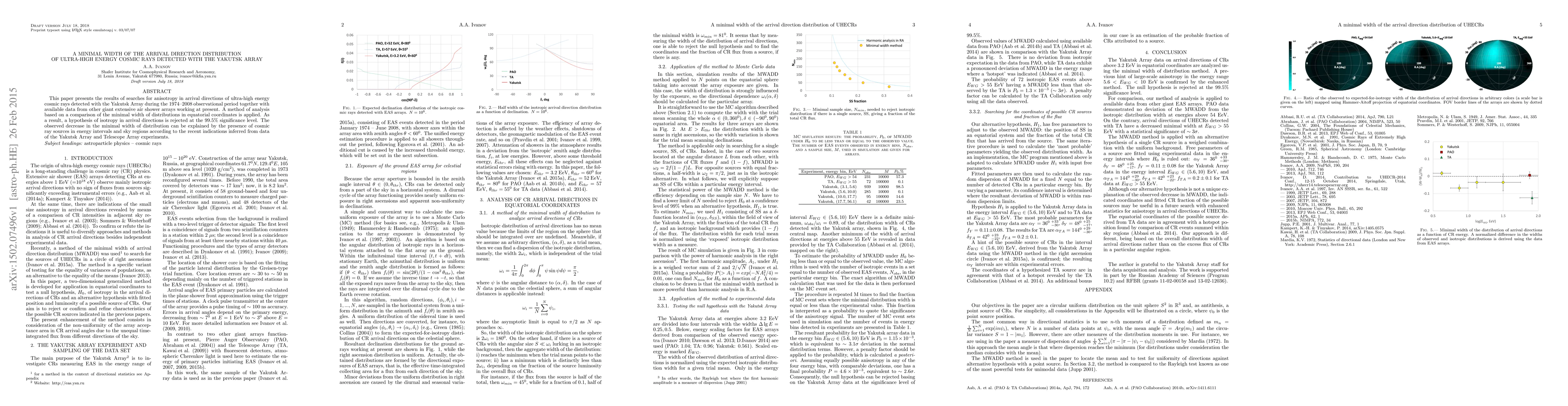 This paper presents the results of searches for anisotropy in arrival directions of ultra-high energy cosmic rays detected with the Yakutsk Array during the 1974--2008 observational period together with available data from other giant extensive air shower arrays working at present. A method of analysis based on a comparison of the minimal width of distributions in equatorial coordinates is applied. As a result, a hypothesis of isotropy in arrival directions is rejected at the $99.5\%$ significance level. The observed decrease in the minimal width of distribution can be explained by the presence of cosmic ray sources in energy intervals and sky regions according to the recent indications inferred from data of the Yakutsk Array and Telescope Array experiments.