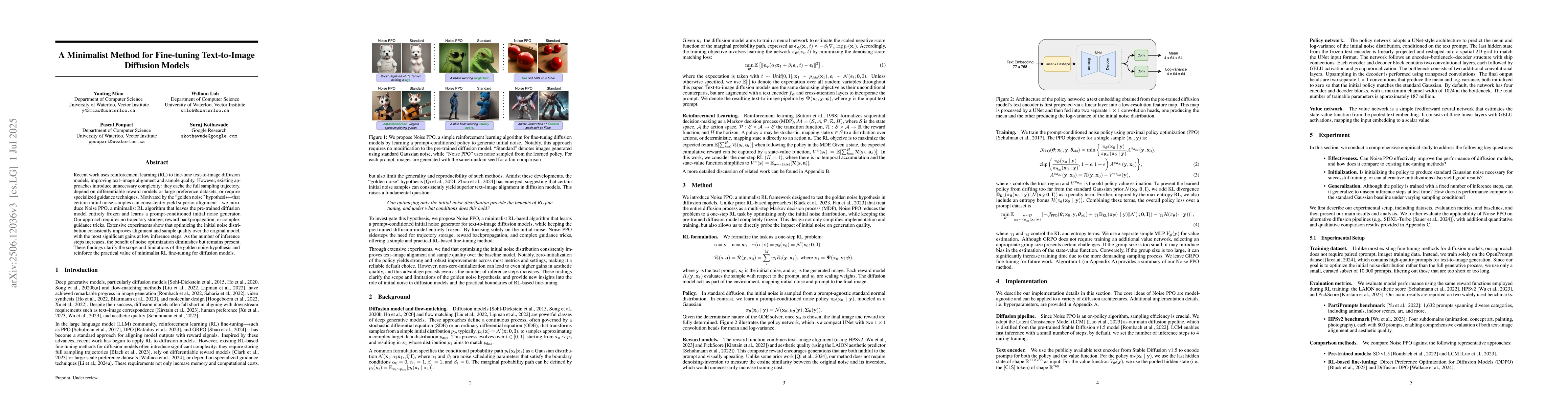 Recent work uses reinforcement learning (RL) to fine-tune text-to-image diffusion models, improving text-image alignment and sample quality. However, existing approaches introduce unnecessary complexity: they cache the full sampling trajectory, depend on differentiable reward models or large preference datasets, or require specialized guidance techniques. Motivated by the "golden noise" hypothesis -- that certain initial noise samples can consistently yield superior alignment -- we introduce Noise PPO, a minimalist RL algorithm that leaves the pre-trained diffusion model entirely frozen and learns a prompt-conditioned initial noise generator. Our approach requires no trajectory storage, reward backpropagation, or complex guidance tricks. Extensive experiments show that optimizing the initial noise distribution consistently improves alignment and sample quality over the original model, with the most significant gains at low inference steps. As the number of inference steps increases, the benefit of noise optimization diminishes but remains present. These findings clarify the scope and limitations of the golden noise hypothesis and reinforce the practical value of minimalist RL fine-tuning for diffusion models.