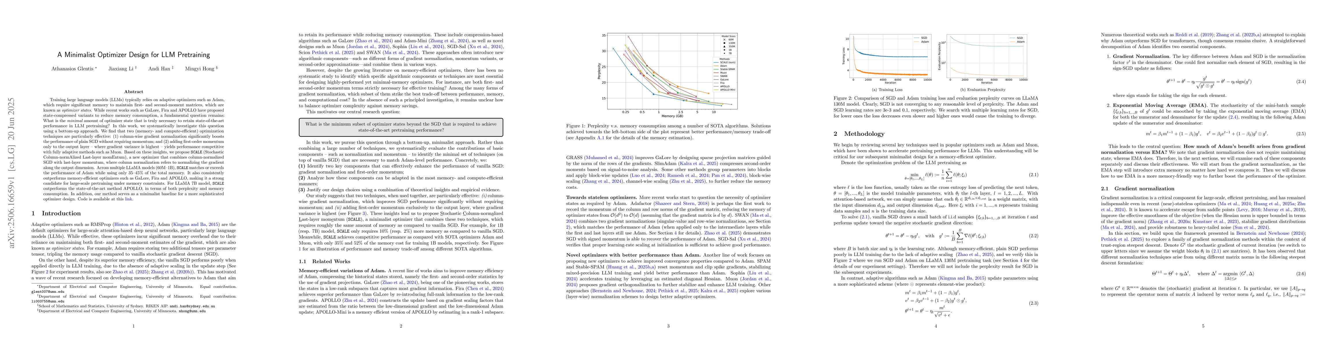Training large language models (LLMs) typically relies on adaptive optimizers such as Adam, which require significant memory to maintain first- and second-moment matrices, known as optimizer states. While recent works such as GaLore, Fira, and APOLLO have proposed state-compressed variants to reduce memory consumption, a fundamental question remains: What is the minimal amount of optimizer state that is truly necessary to retain state-of-the-art performance in LLM pretraining? In this work, we systematically investigate this question using a bottom-up approach. We find that two memory- and compute-efficient optimization techniques are particularly effective: (1) column-wise gradient normalization significantly boosts the performance of plain SGD without requiring momentum; and (2) adding first-order momentum only to the output layer - where gradient variance is highest - yields performance competitive with fully adaptive methods such as Muon. Based on these insights, we propose SCALE (Stochastic Column-normalized Last-layer Momentum), a new optimizer that combines column-normalized SGD with last-layer momentum, where column normalization refers to normalizing the gradient along the output dimension. Across multiple LLaMA models (60M-1B), SCALE matches or exceeds the performance of Adam while using only 35-45% of the total memory. It also consistently outperforms memory-efficient optimizers such as GaLore, Fira, and APOLLO, making it a strong candidate for large-scale pretraining under memory constraints. For the LLaMA 7B model, SCALE outperforms the state-of-the-art method APOLLO in terms of both perplexity and memory consumption. In addition, our method serves as a minimalist baseline for more sophisticated optimizer design.