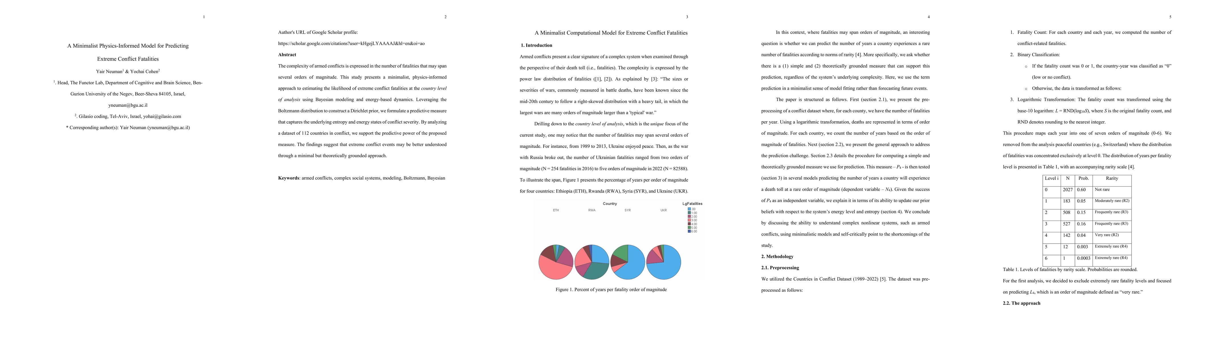 The complexity of armed conflicts is expressed in the number of fatalities that may span several orders of magnitude. This study presents a minimalist, physics-informed approach to estimating the likelihood of extreme conflict fatalities at the country level of analysis using Bayesian modeling and energy-based dynamics. Leveraging the Boltzmann distribution to construct a Dirichlet prior, we formulate a predictive measure that captures the underlying entropy and energy states of conflict severity. By analyzing a dataset of 112 countries in conflict, we support the predictive power of the proposed measure. The findings suggest that extreme conflict events may be better understood through a minimal but theoretically grounded approach.