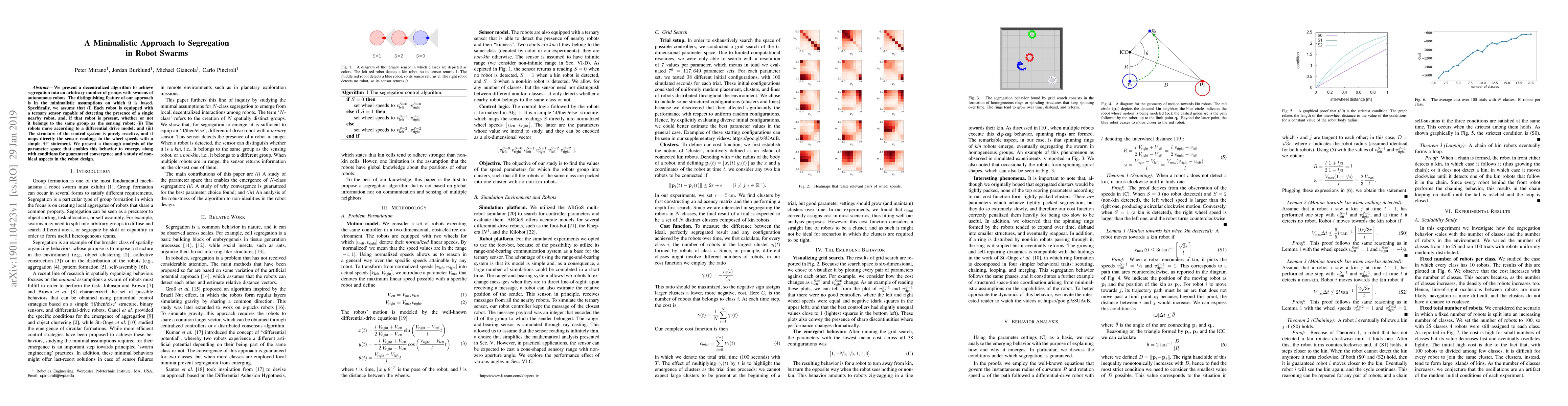 This paper introduces a decentralized algorithm for autonomous robot swarms to segregate into multiple groups based on minimalistic assumptions, including a ternary sensor for detecting nearby robots and a simple reactive control system. The study analyzes conditions for guaranteed convergence and explores non-ideal robot design aspects.