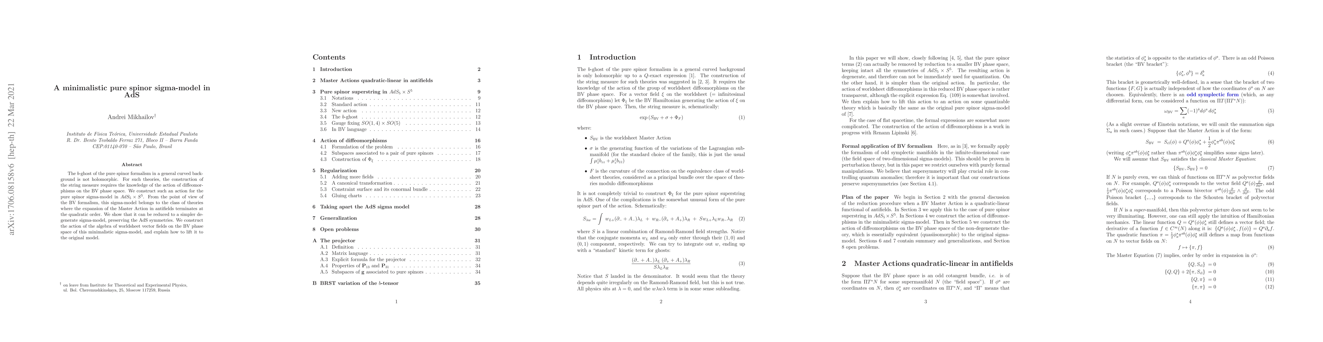 The $b$-ghost of the pure spinor formalism in a general curved background is not holomorphic. For such theories, the construction of the string measure requires the knowledge of the action of diffeomorphisms on the BV phase space. We construct such an action for the pure spinor sigma-model in $AdS_5\times S^5$. From the point of view of the BV formalism, this sigma-model belongs to the class of theories where the expansion of the Master Action in antifields terminates at the quadratic order. We show that it can be reduced to a simpler degenerate sigma-model, preserving the AdS symmetries. We construct the action of the algebra of worldsheet vector fields on the BV phase space of this minimalistic sigma-model, and explain how to lift it to the original model.