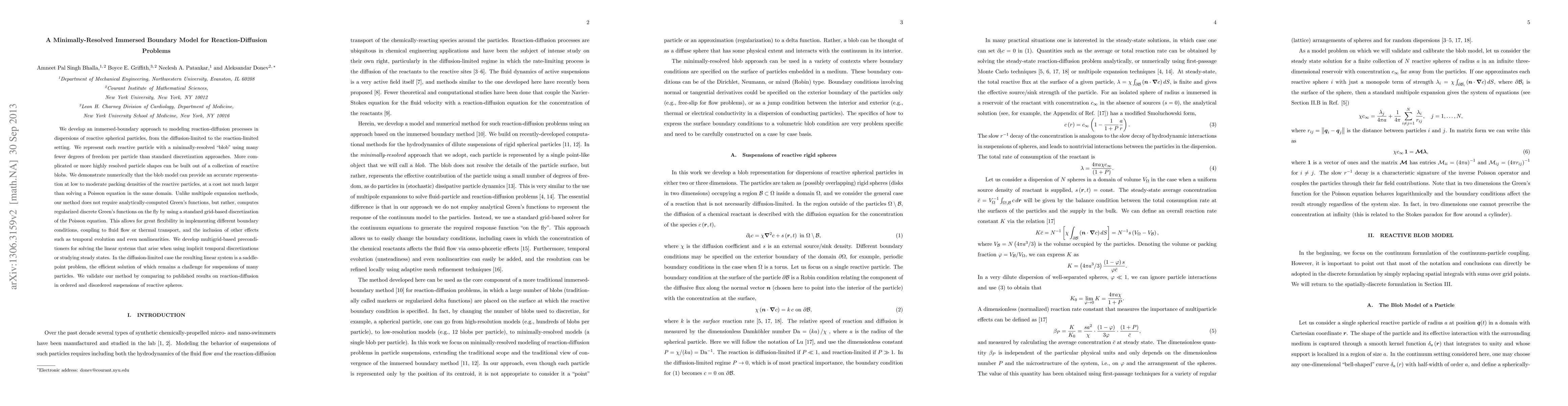 We develop an immersed-boundary approach to modeling reaction-diffusion processes in dispersions of reactive spherical particles, from the diffusion-limited to the reaction-limited setting. We represent each reactive particle with a minimally-resolved 'blob' using many fewer degrees of freedom per particle than standard discretization approaches. More complicated or more highly resolved particle shapes can be built out of a collection of reactive blobs. We demonstrate numerically that the blob model can provide an accurate representation at low to moderate packing densities of the reactive particles, at a cost not much larger than solving a Poisson equation in the same domain. Unlike multipole expansion methods, our method does not require analytically-computed Green's functions, but rather, computes regularized discrete Green's functions on the fly by using a standard grid-based discretization of the Poisson equation. This allows for great flexibility in implementing different boundary conditions, coupling to fluid flow or thermal transport, and the inclusion of other effects such as temporal evolution and even nonlinearities. We develop multigrid-based preconditioners for solving the linear systems that arise when using implicit temporal discretizations or studying steady states. In the diffusion-limited case the resulting linear system is a saddle-point problem, the efficient solution of which remains a challenge for suspensions of many particles. We validate our method by comparing to published results on reaction-diffusion in ordered and disordered suspensions of reactive spheres.