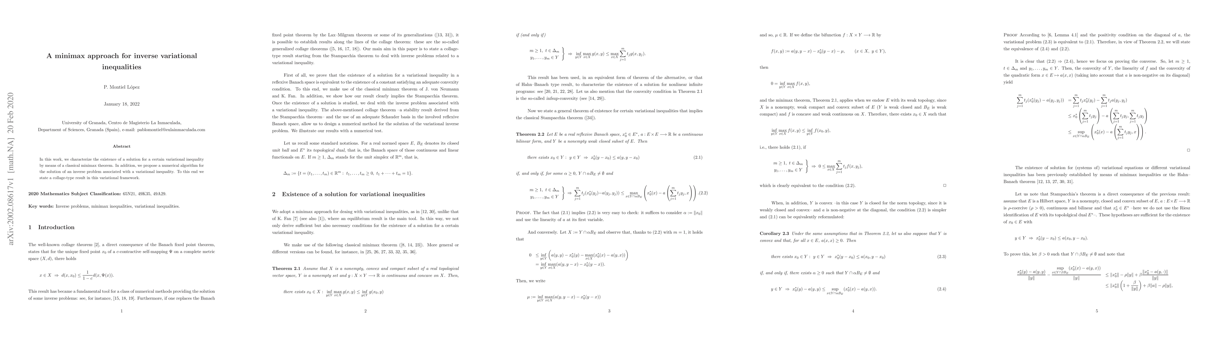 In this work, we characterize the existence of solution for a certain variational inequality by means of a classical minimax theorem. In addition, we propose a numerical algorithm for the solution of an inverse problem associated with a variational inequality. To this end we state a collage-type result in this variational framework.